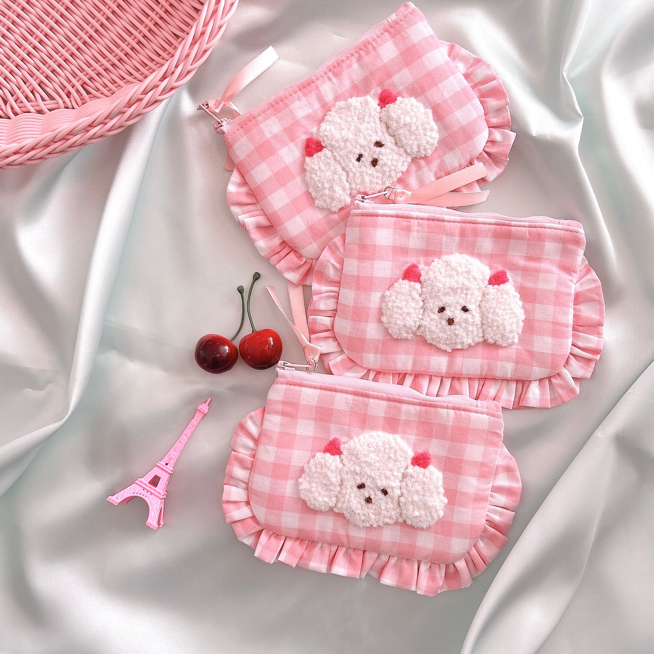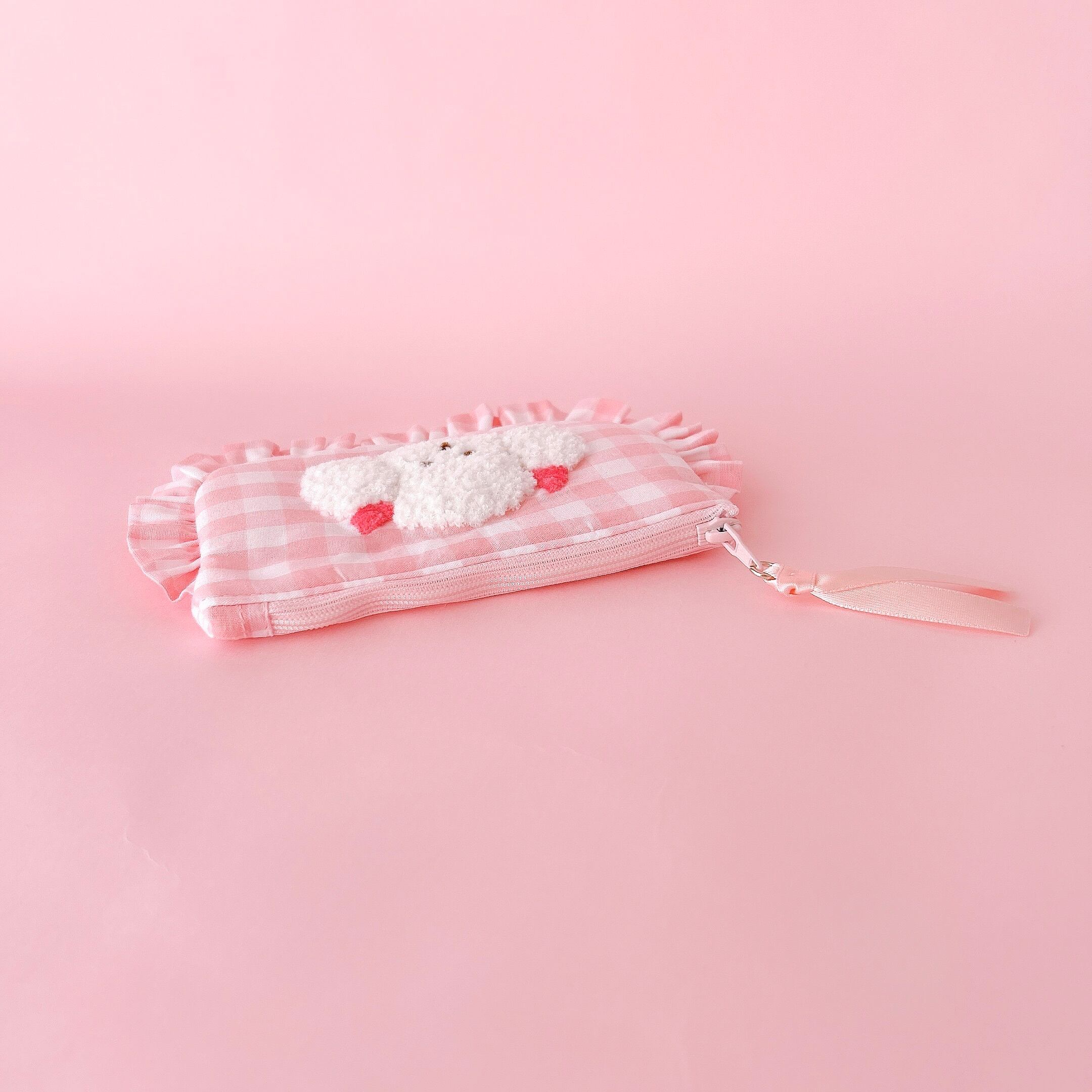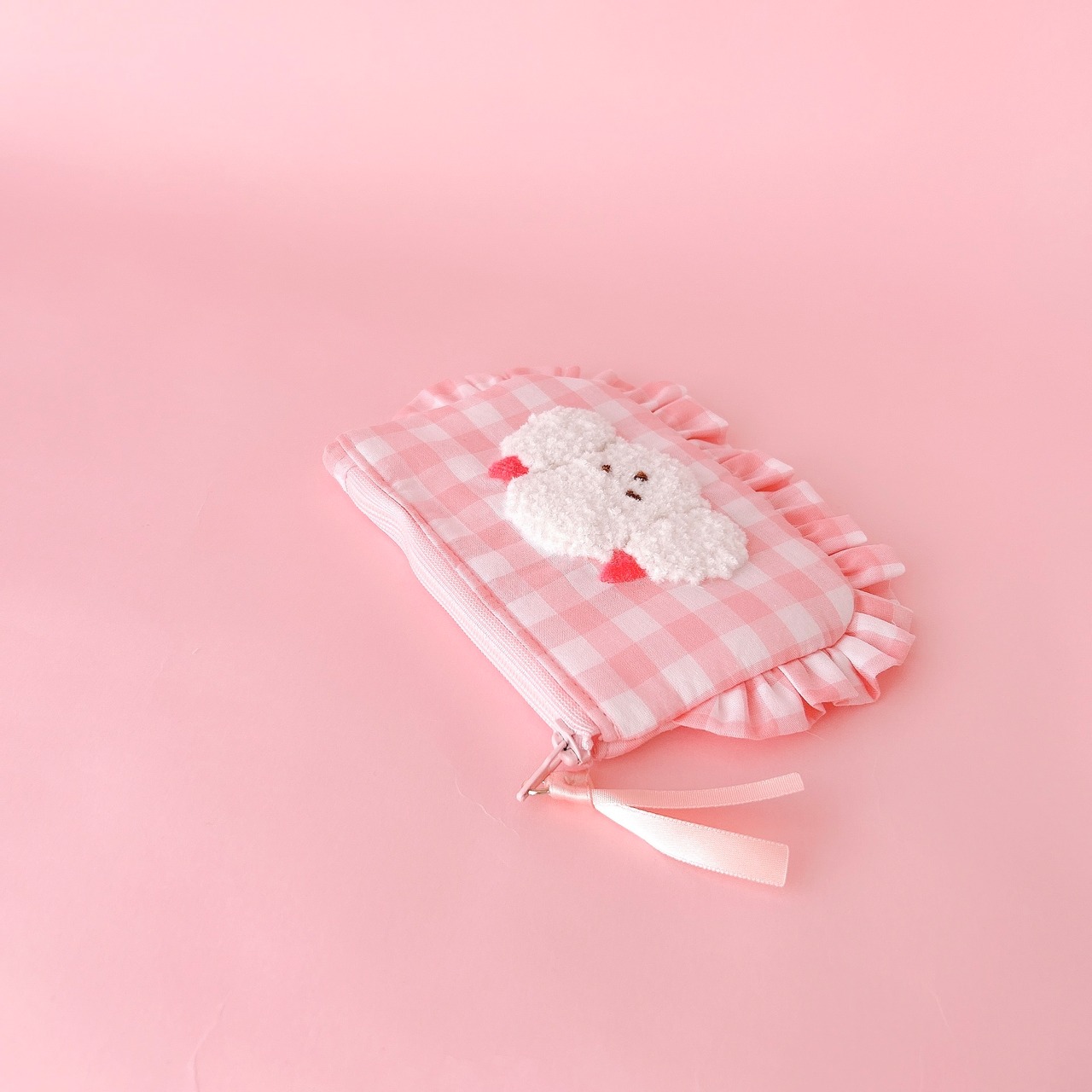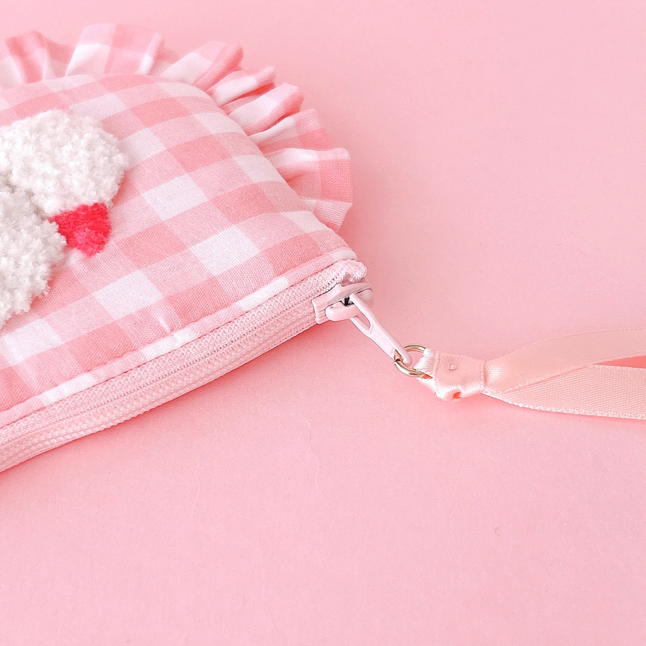 ぺたんこポーチ(ピンクギンガム/モコモコプードル刺繍)
