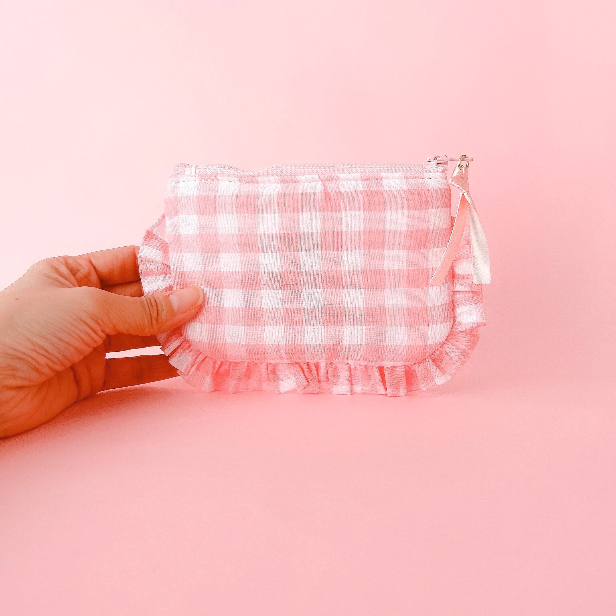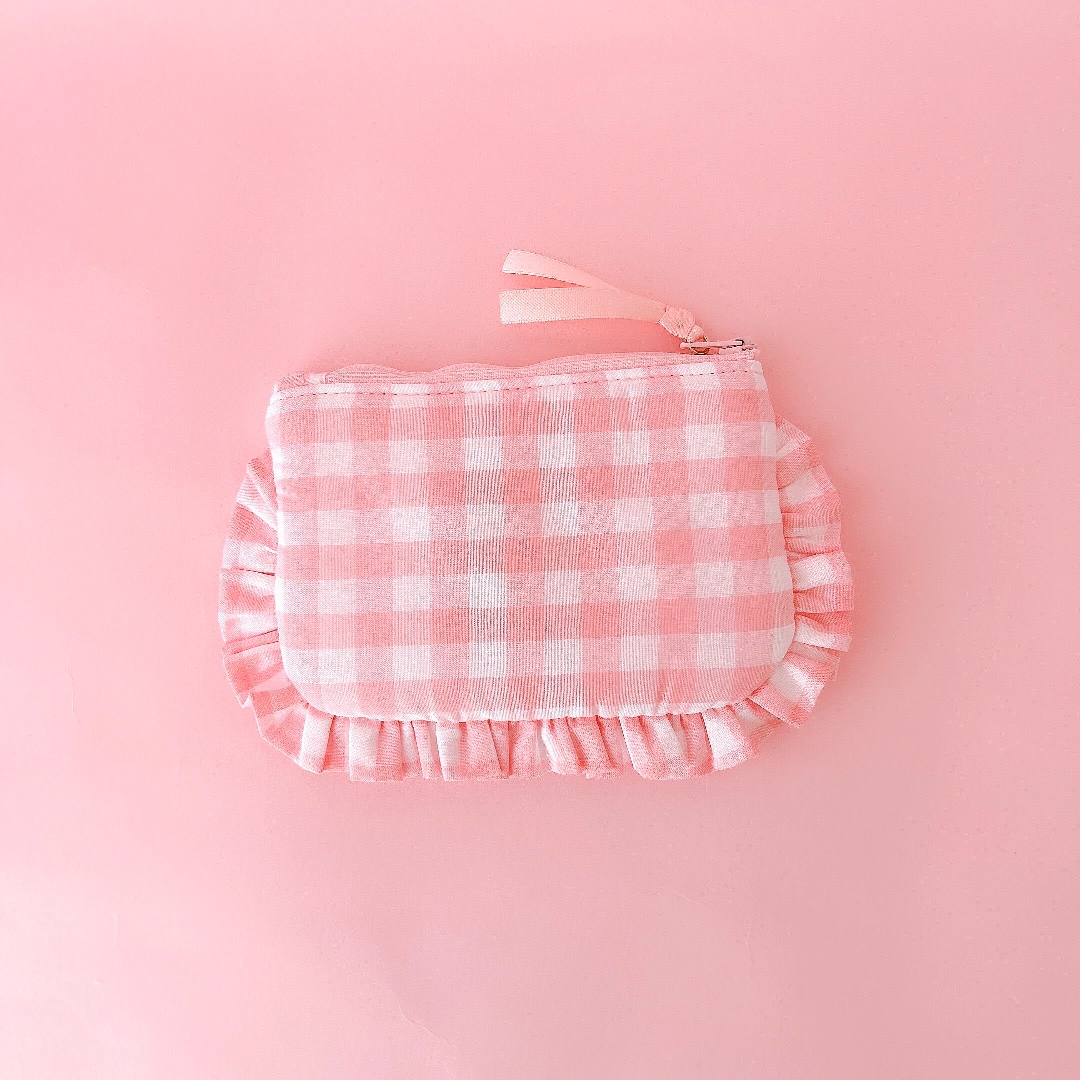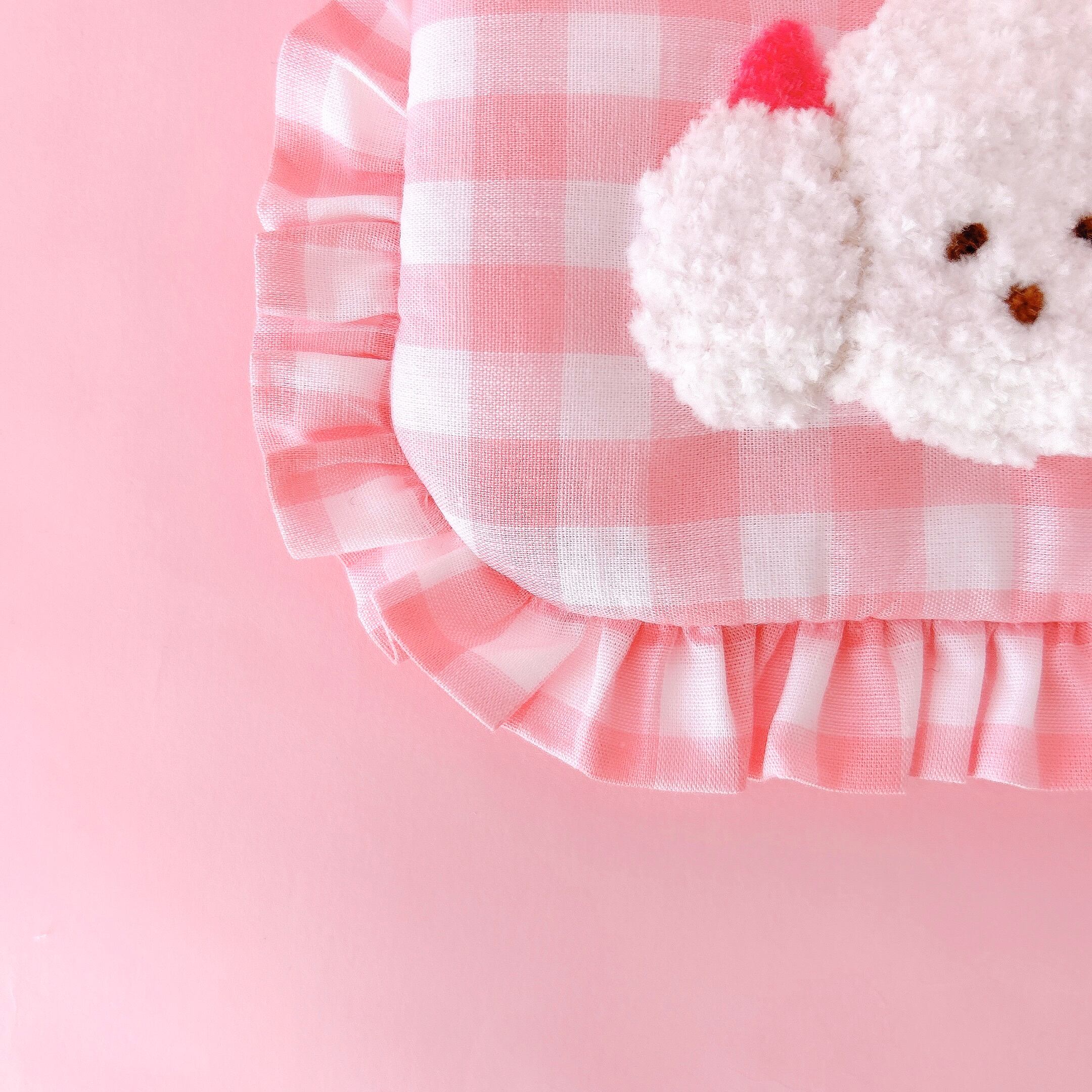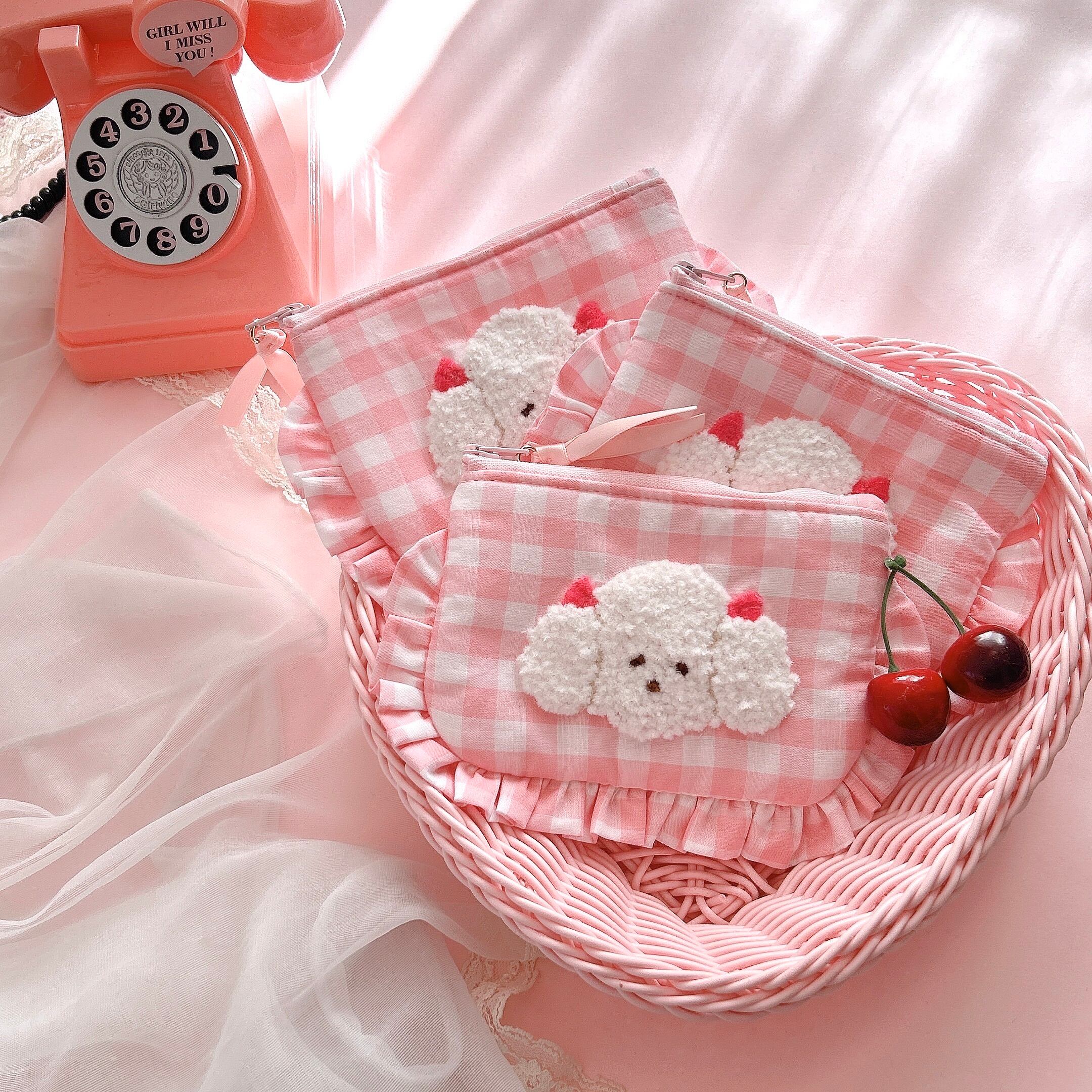 ぺたんこポーチ(ピンクギンガム/モコモコプードル刺繍)