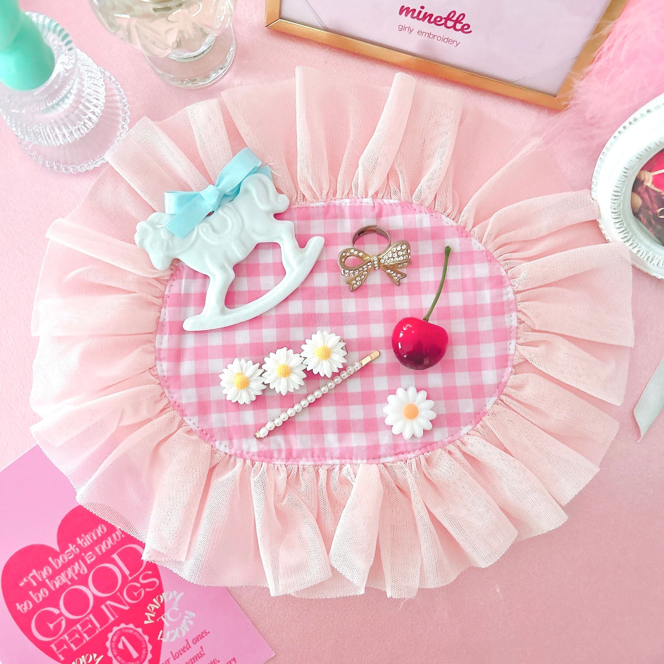 この敷物の上にお気に入りの人形を置いてみたり、アクセサリー置き場にしたり、棚の上に乱雑に置かれたものも可愛い敷物の上に置けばそれだけでお部屋が可愛くなります!