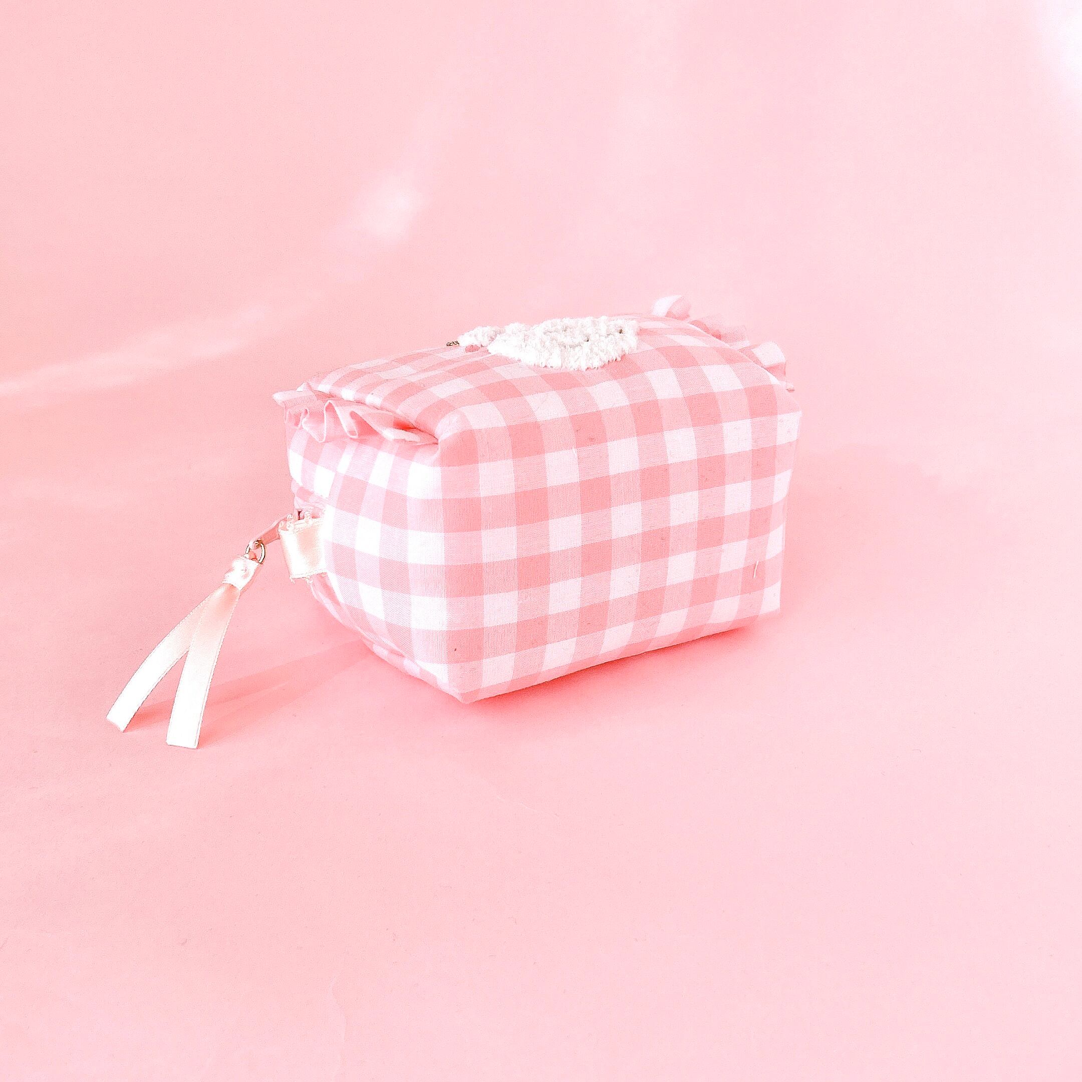 ボックスポーチ(ピンクギンガム/モコモコスワン刺繍)