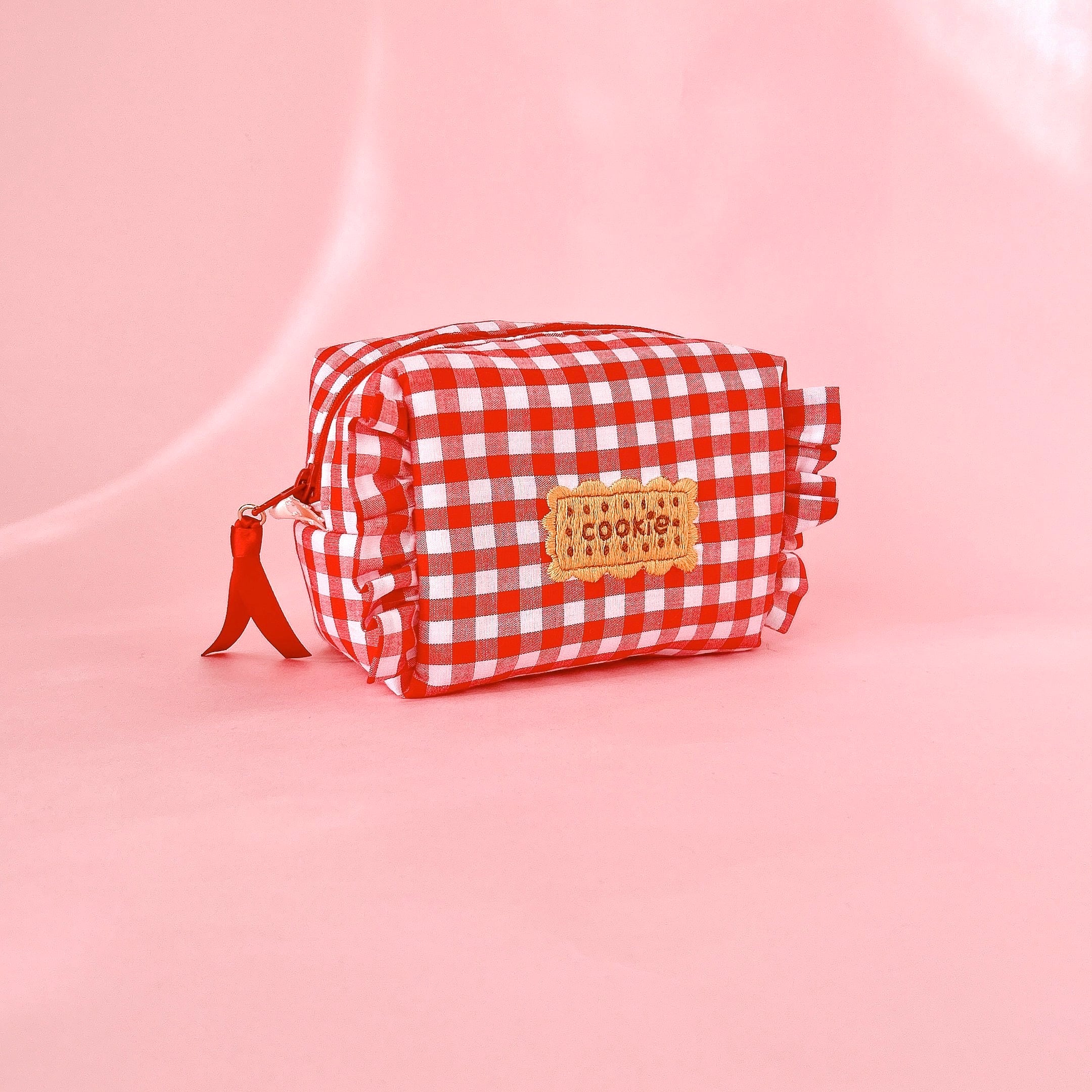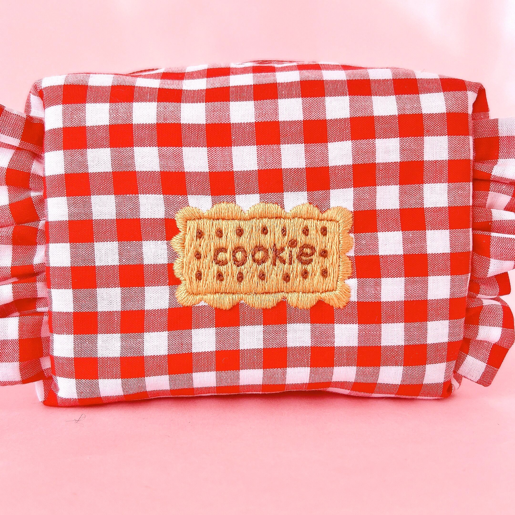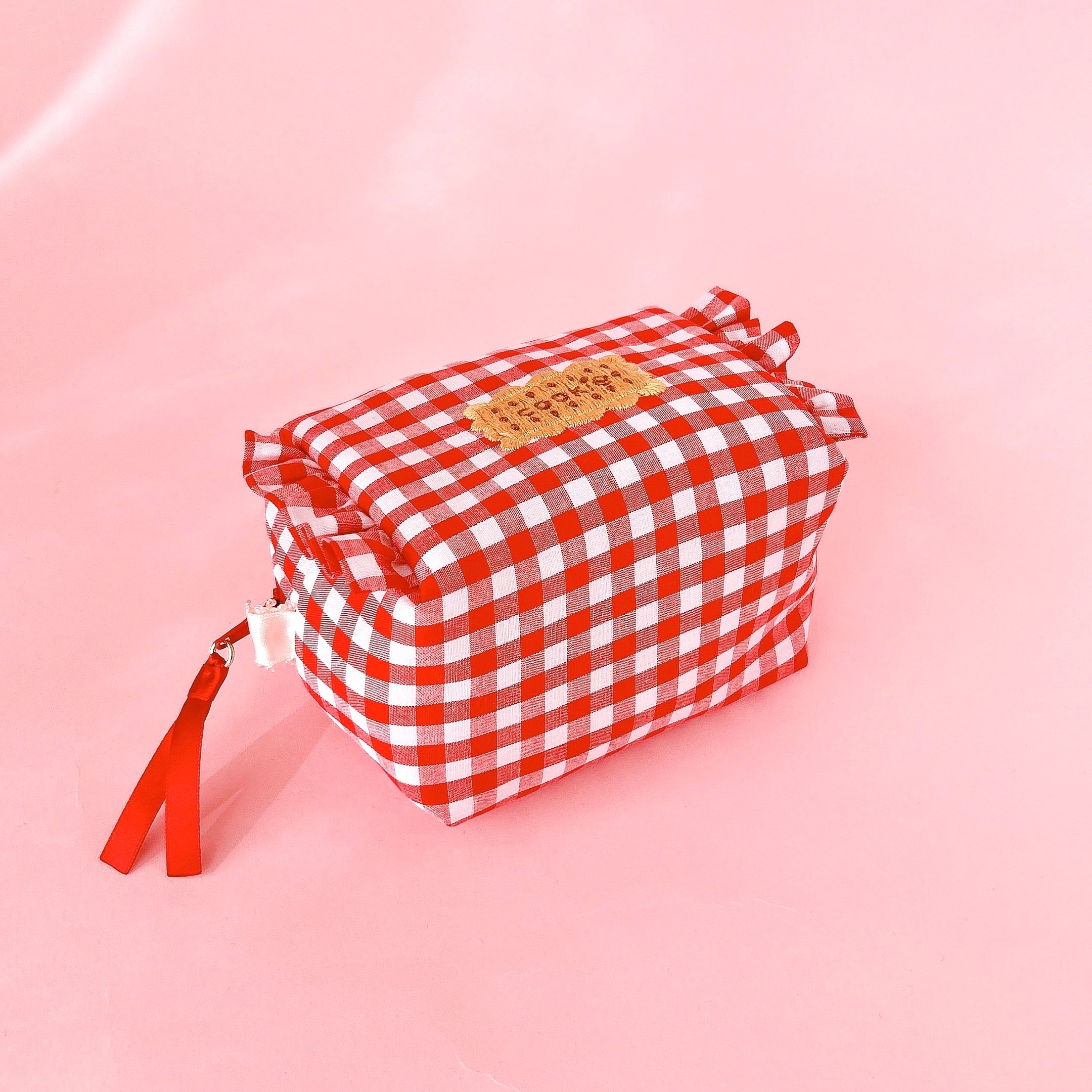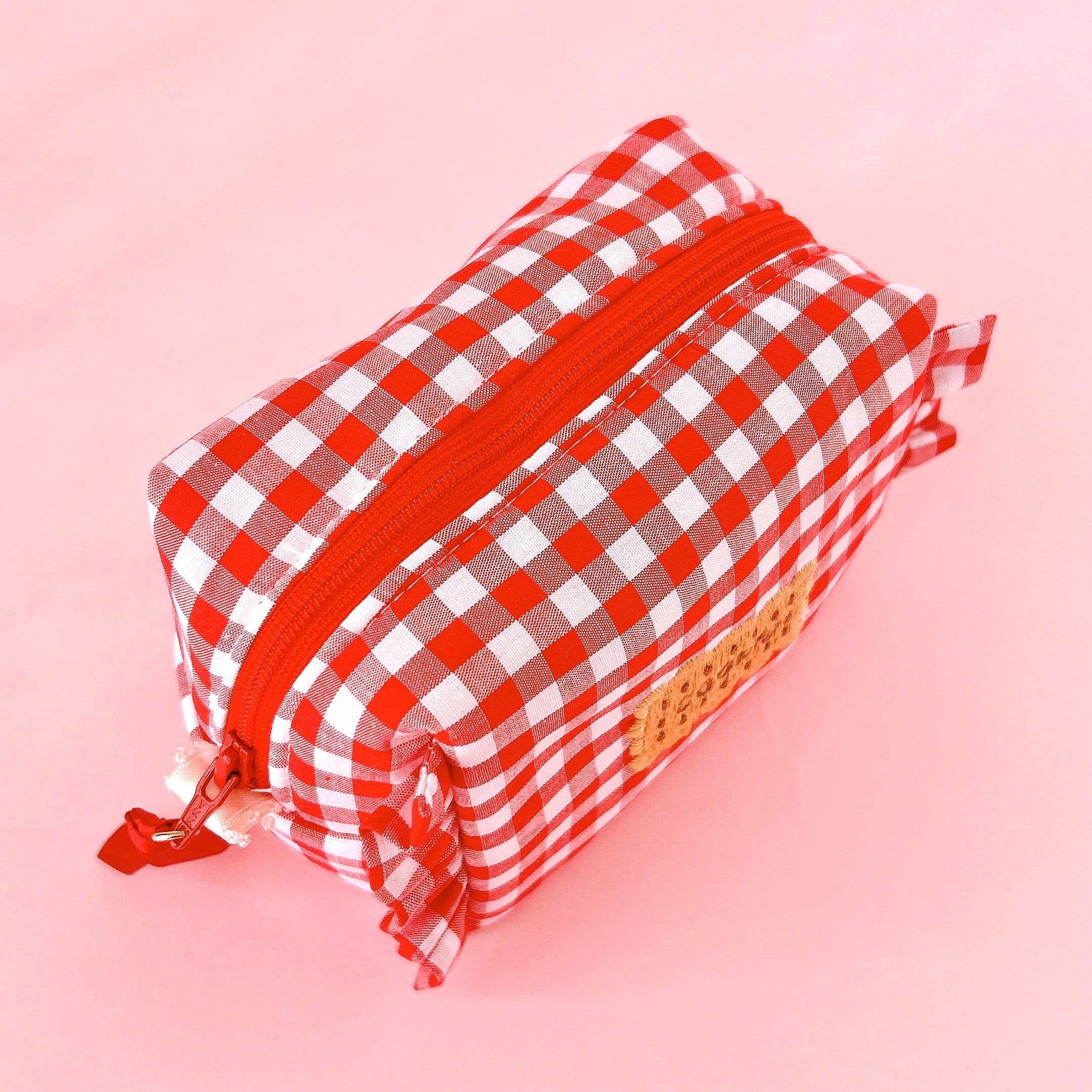 ボックスポーチ(赤ギンガム/クッキー刺繍)