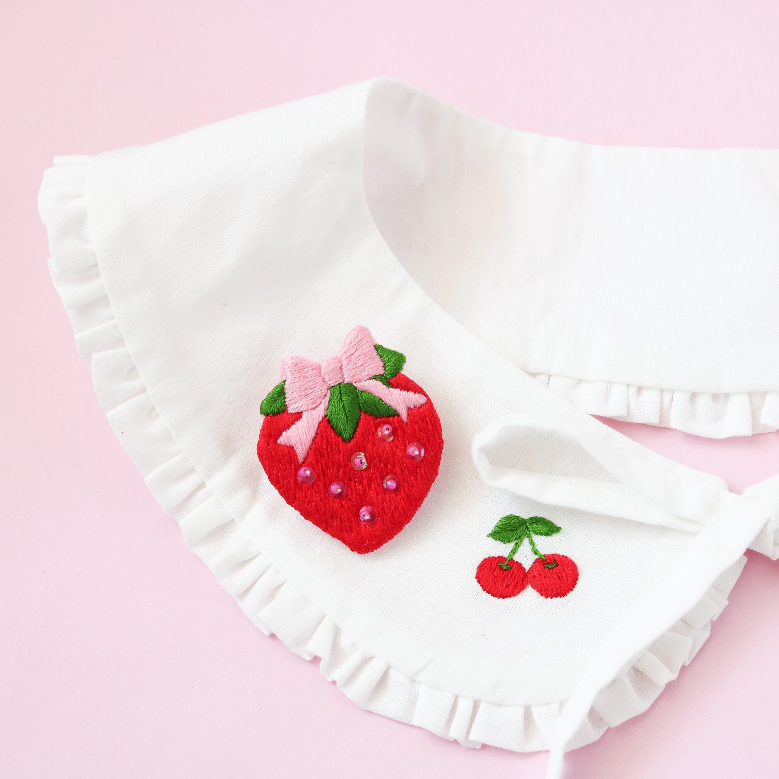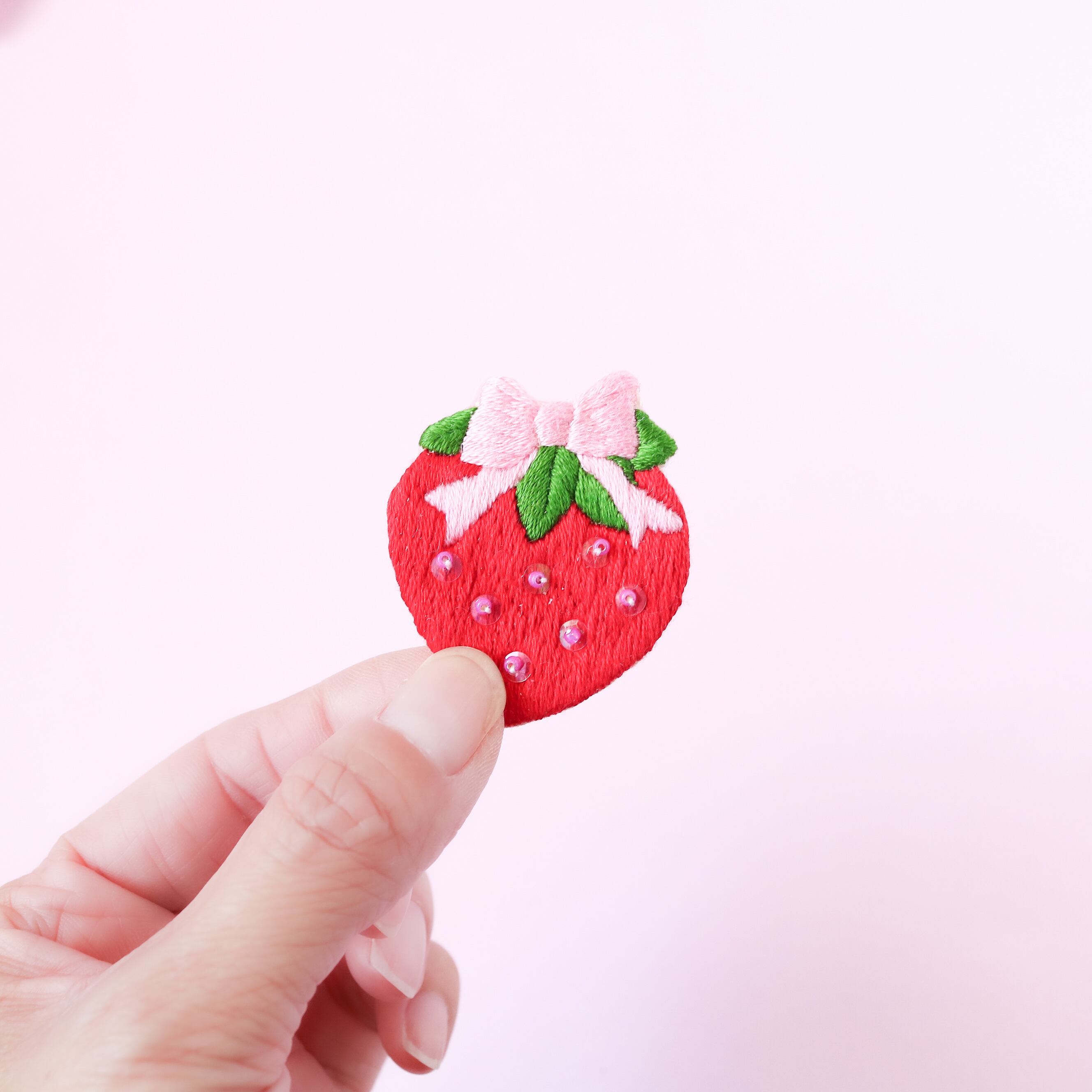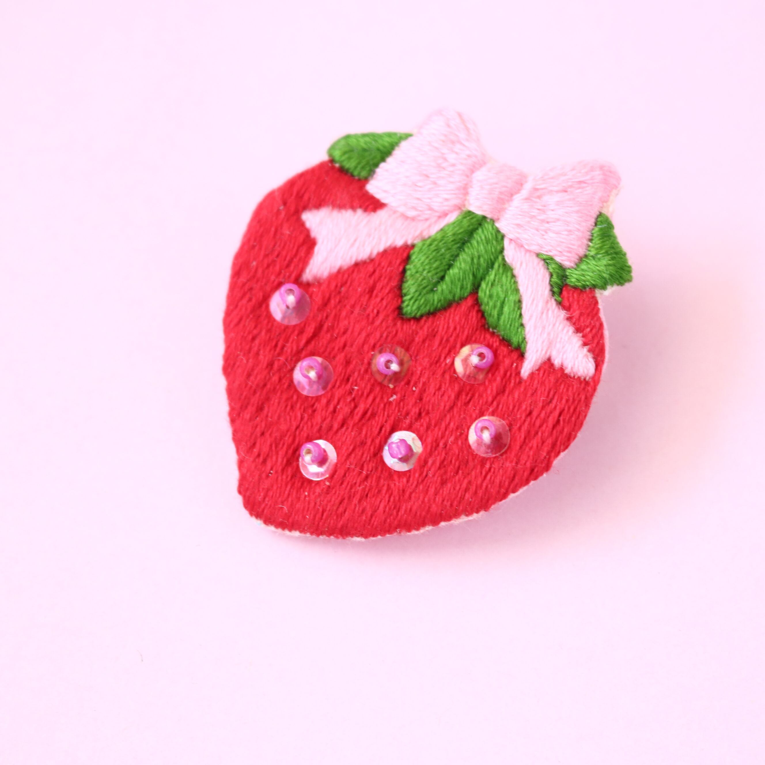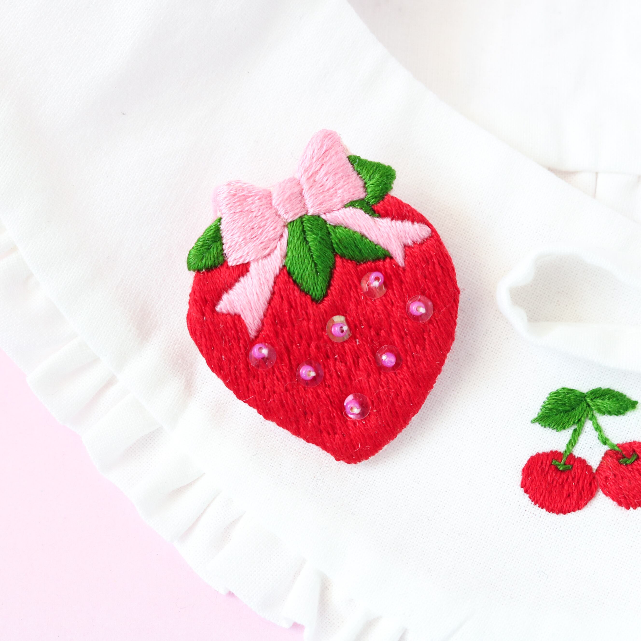 おリボンを付けた真っ赤なイチゴの刺繍ブローチ