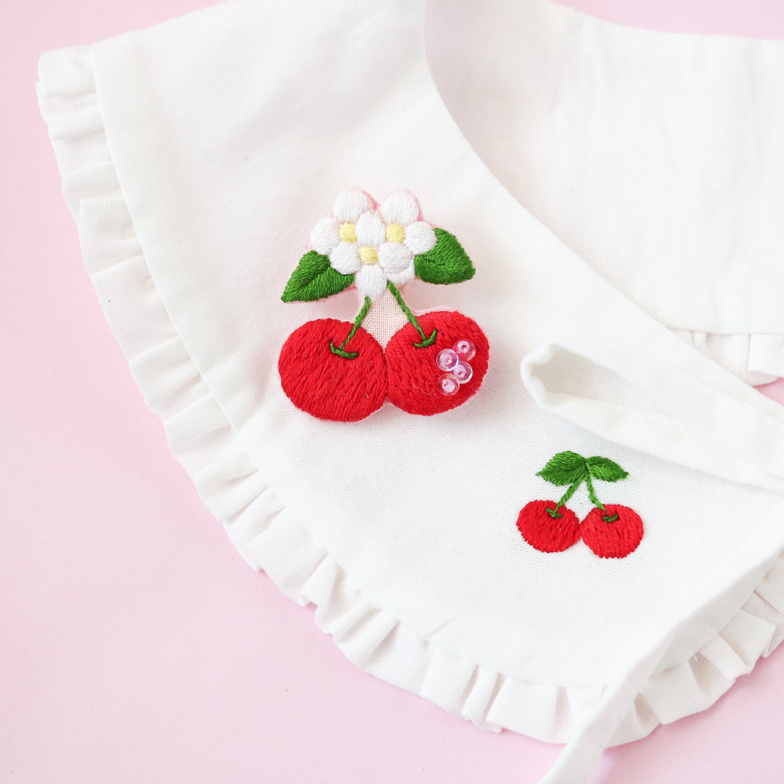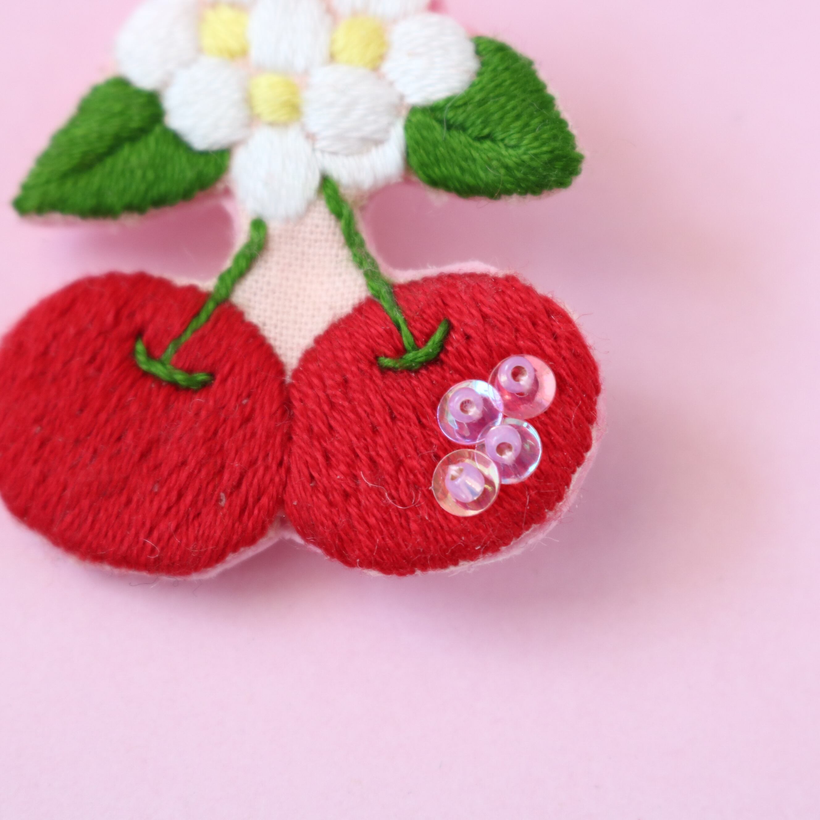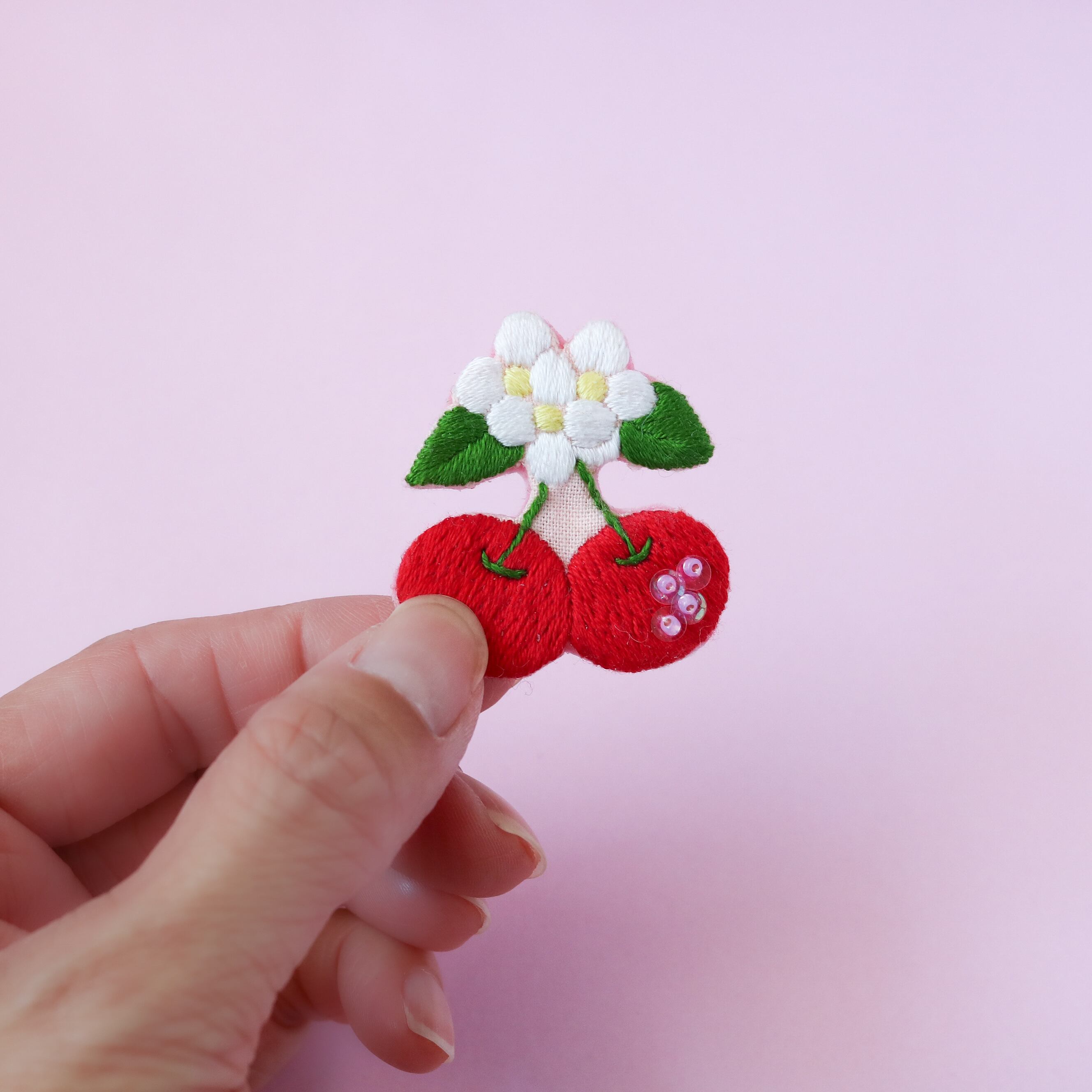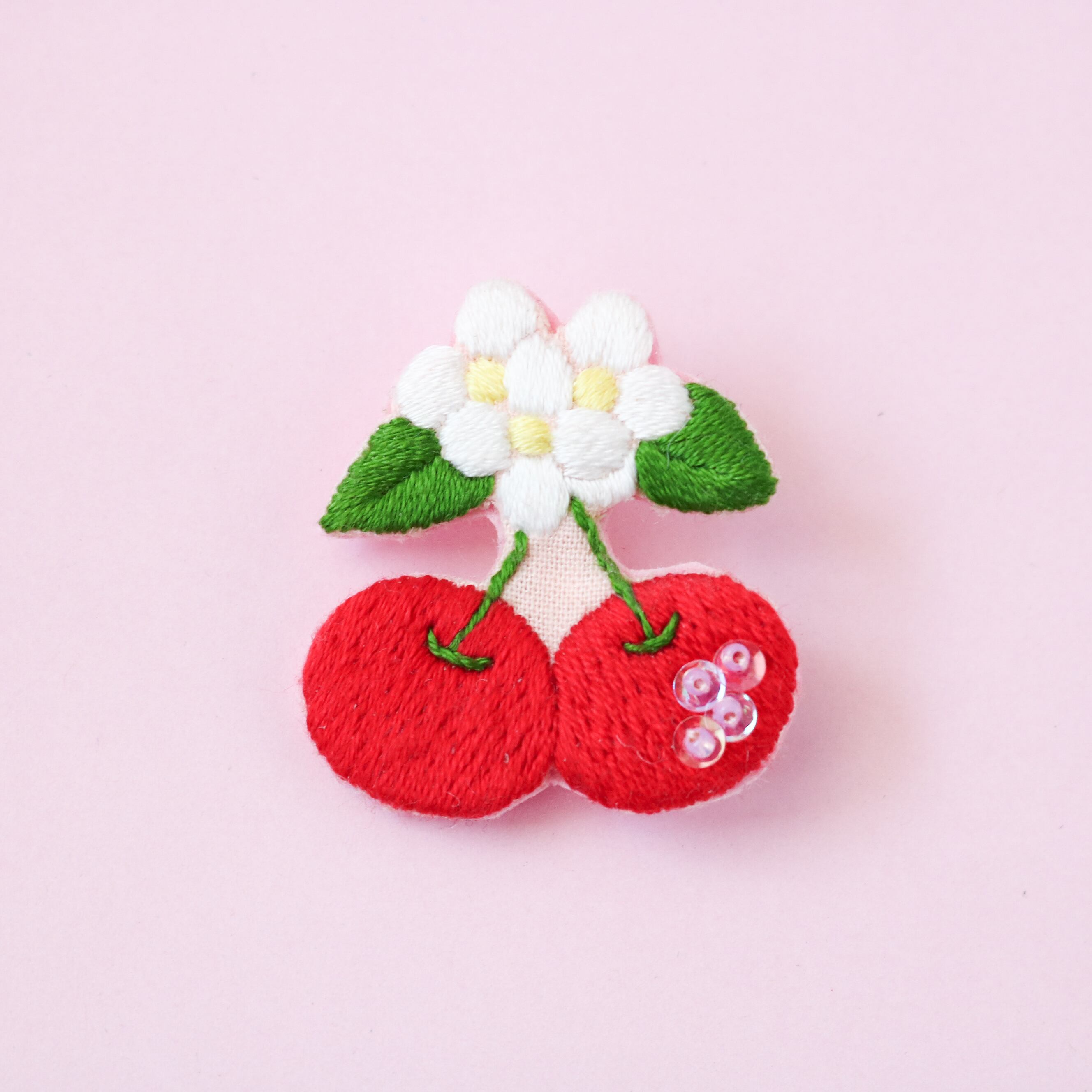 白いお花を付けた可愛いチェリーの刺繍ブローチ