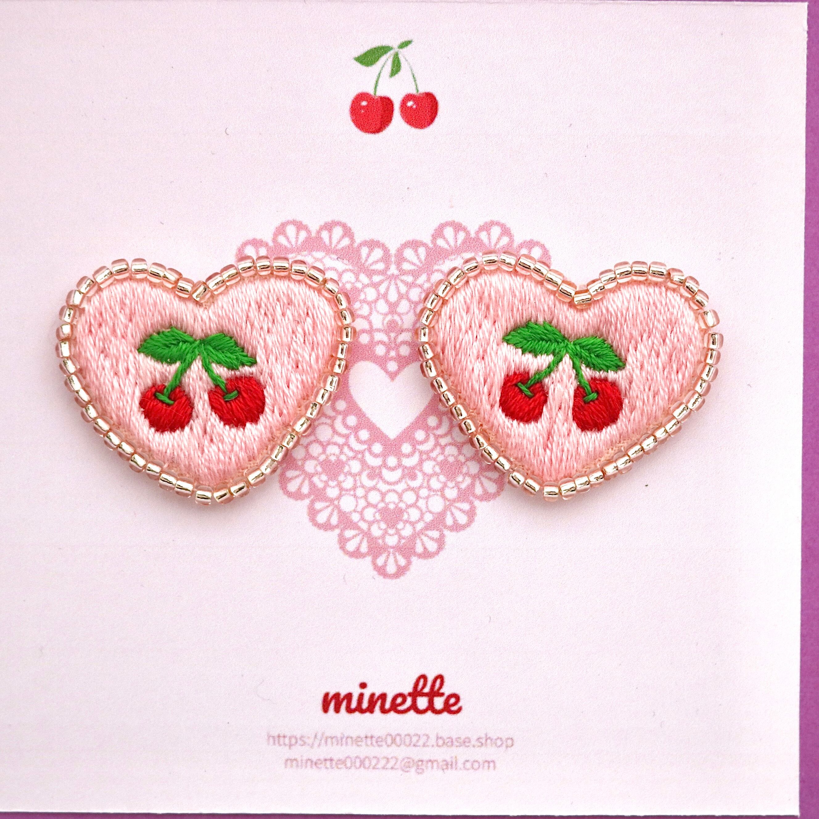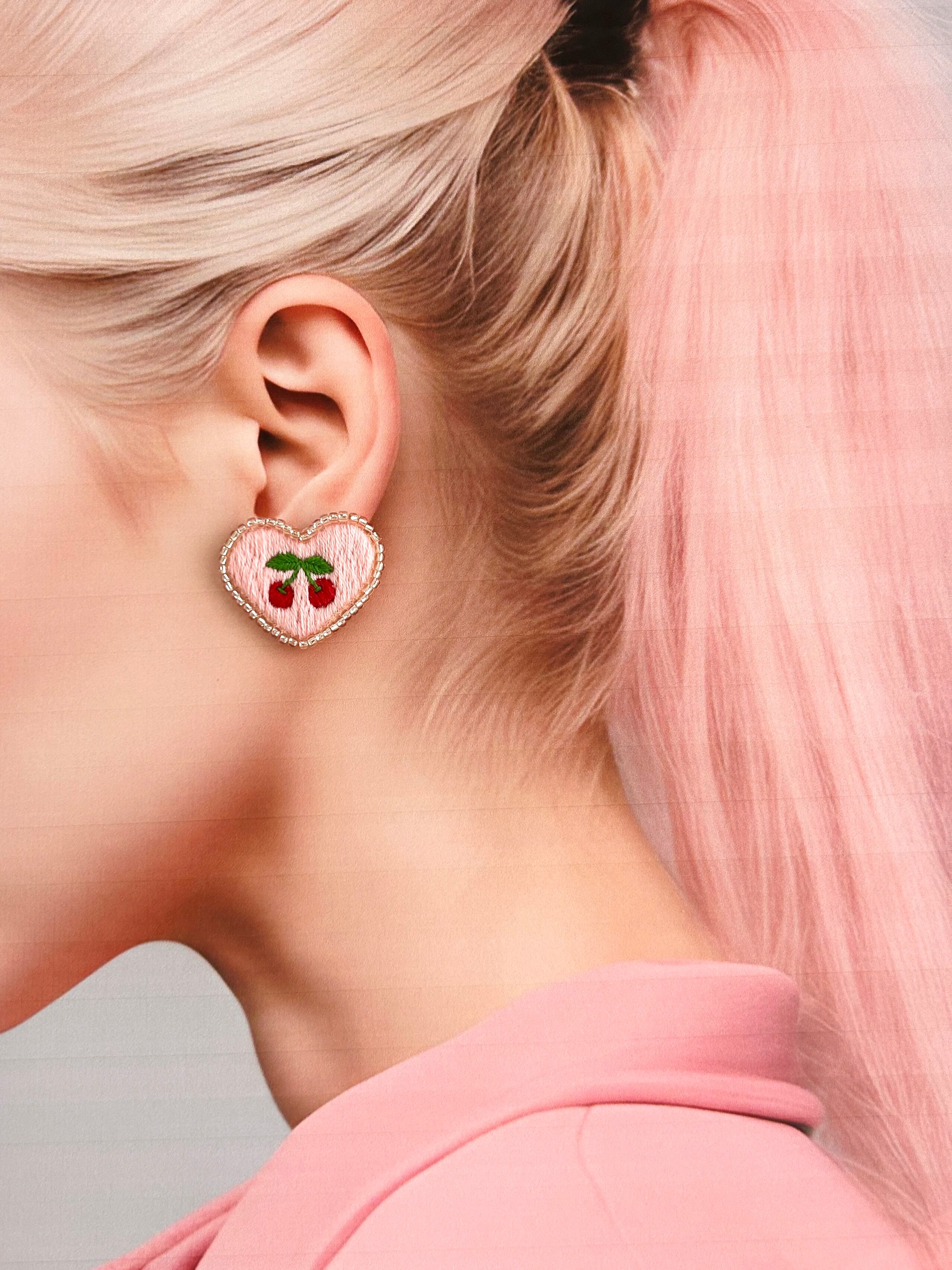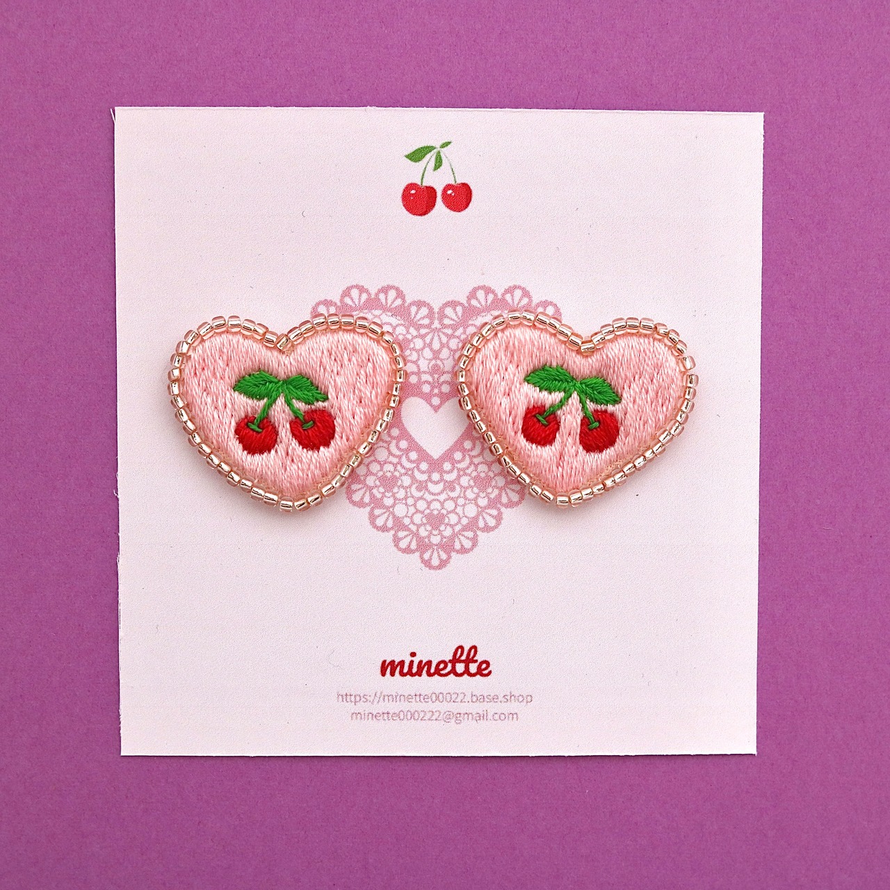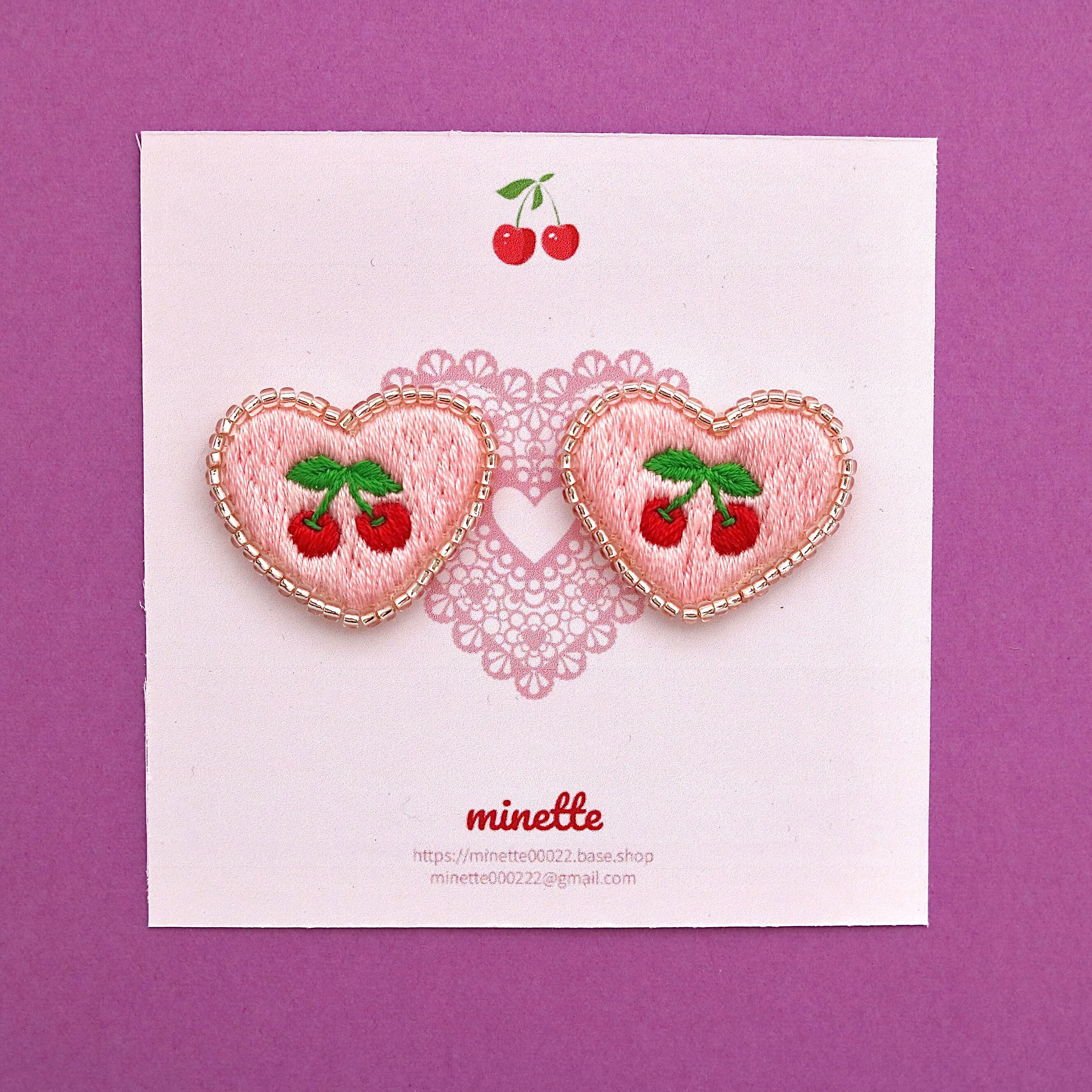 ハート型の中にチェリーを刺繍した可愛いベーシックな耳飾り