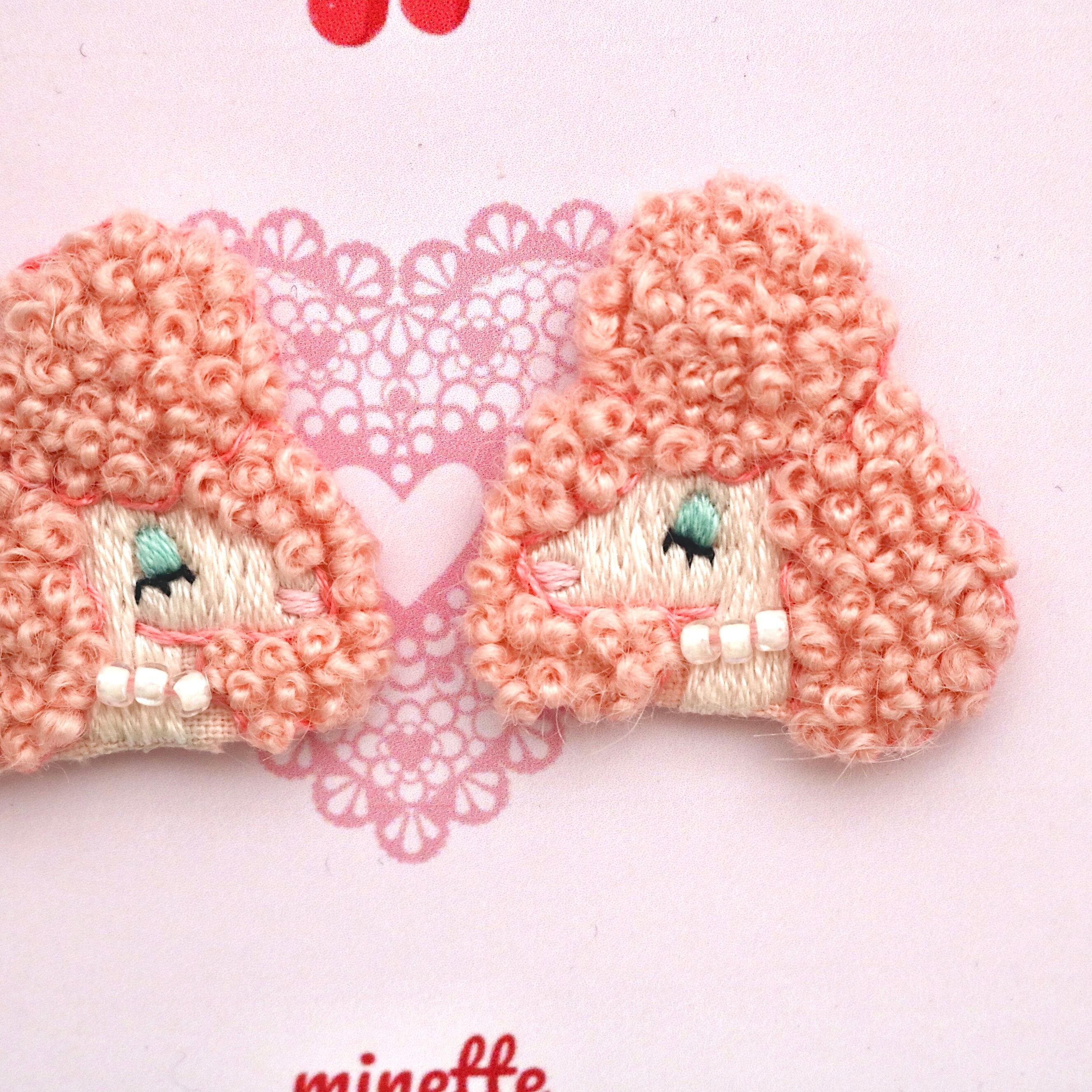 ベビーピンクのモヘア毛糸でくるくる巻き毛のプードルちゃんを刺繍しました!