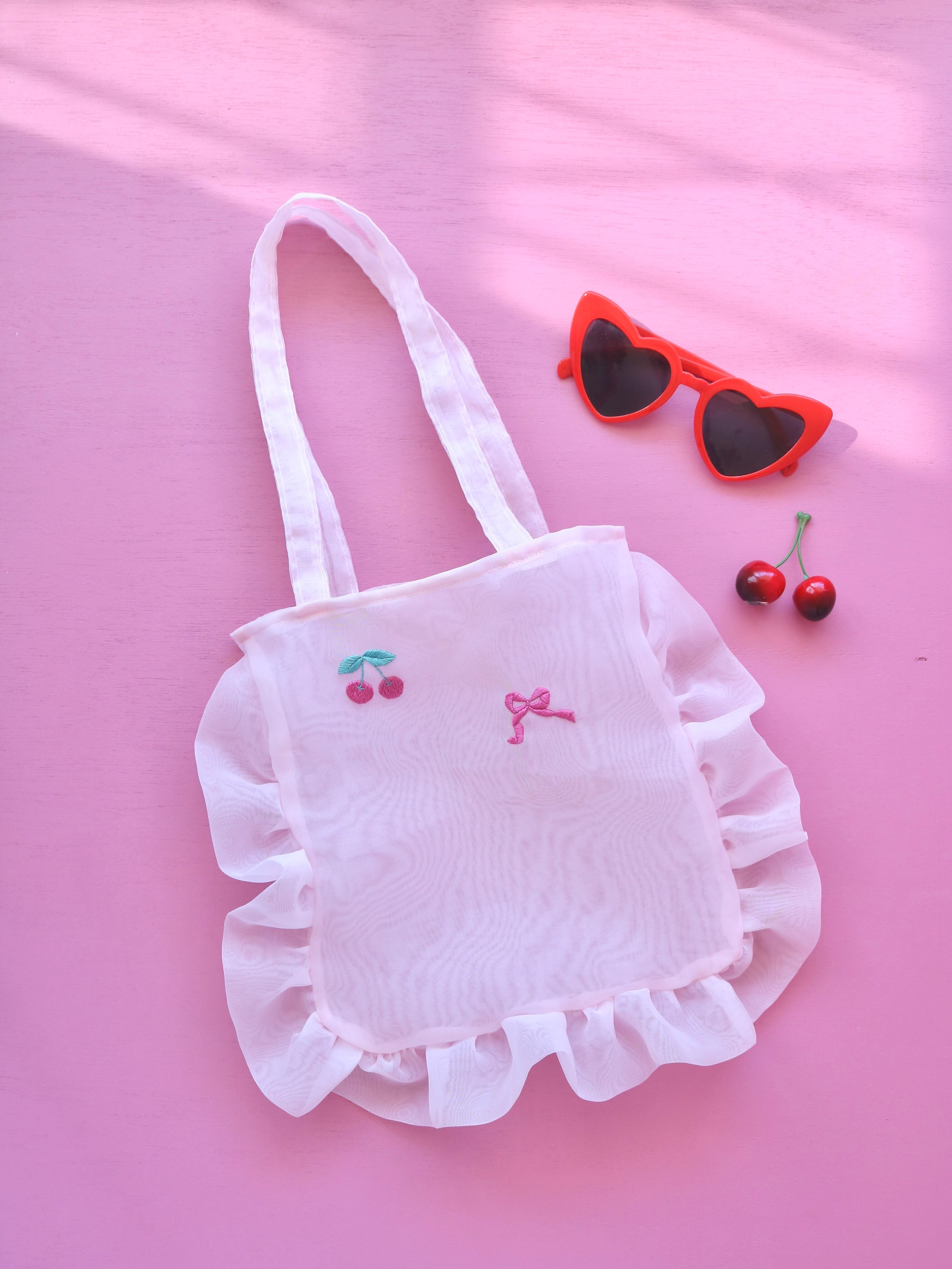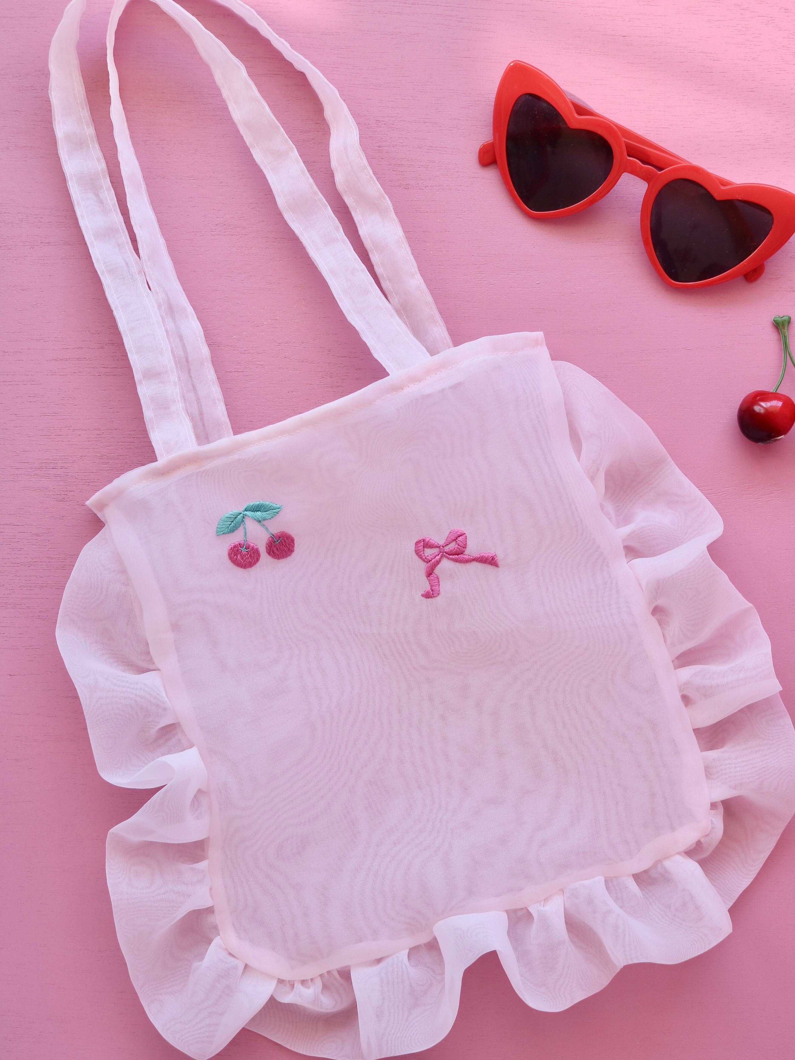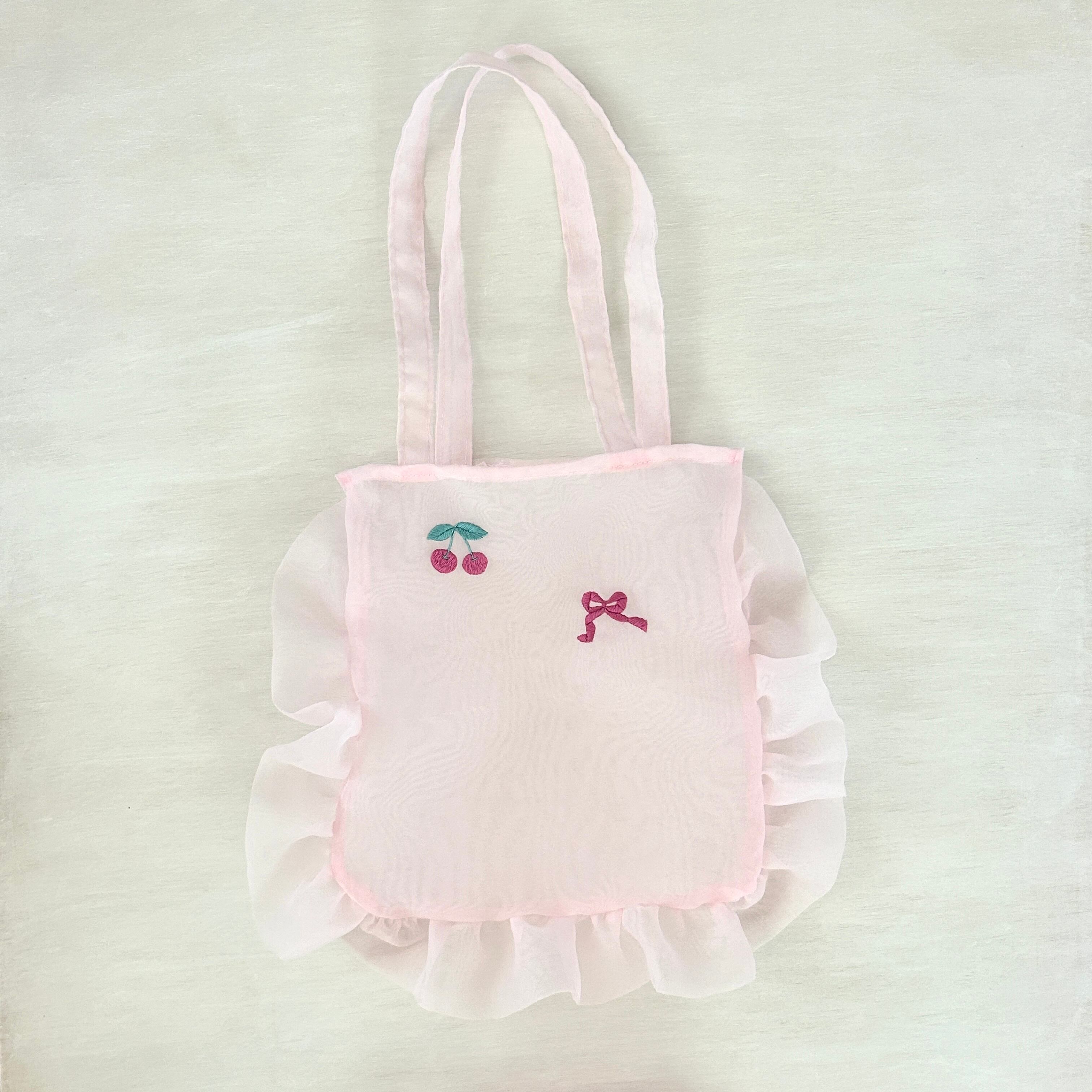 オーガンジートートバッグ(ピンクオーガンジー/チェリーとリボン刺繍)