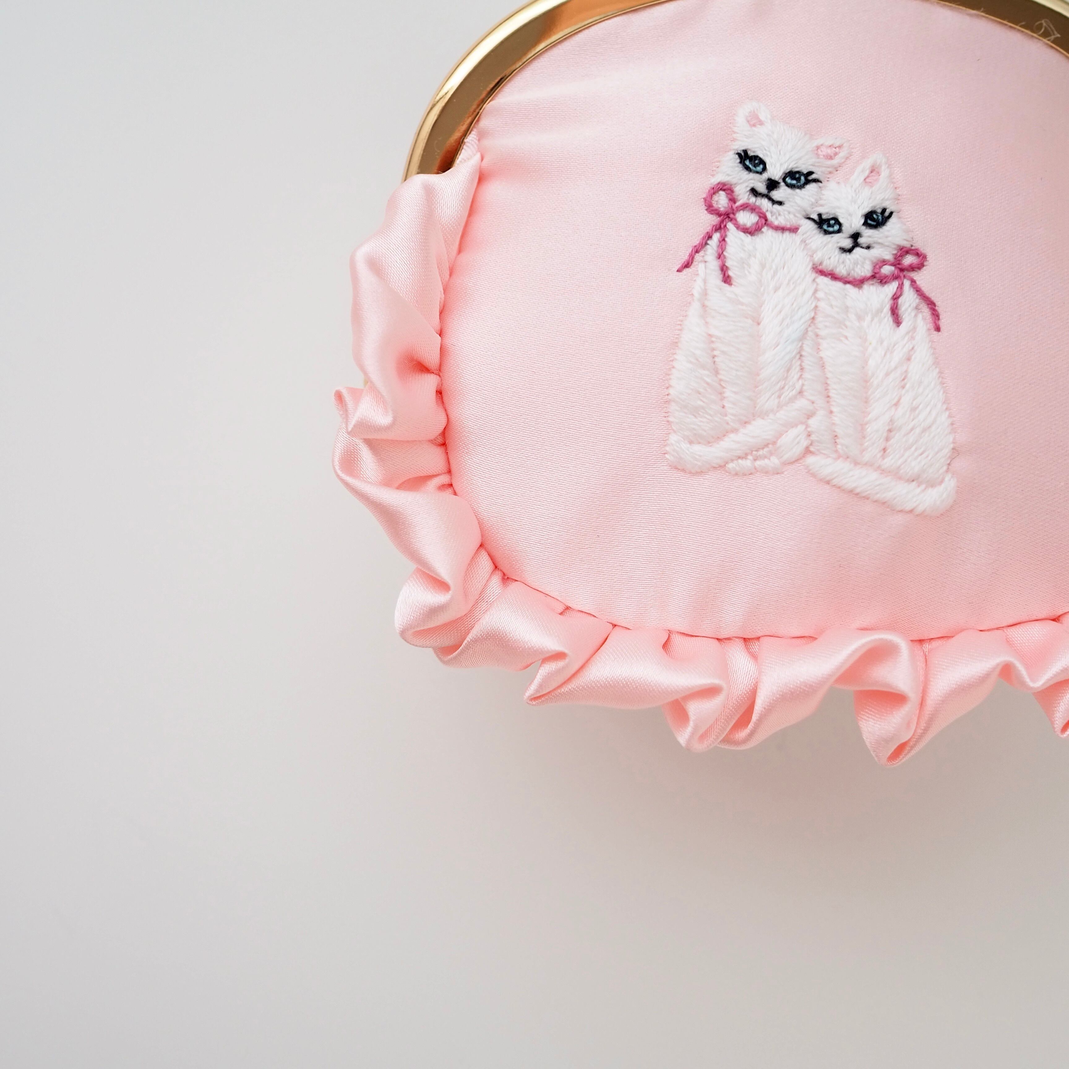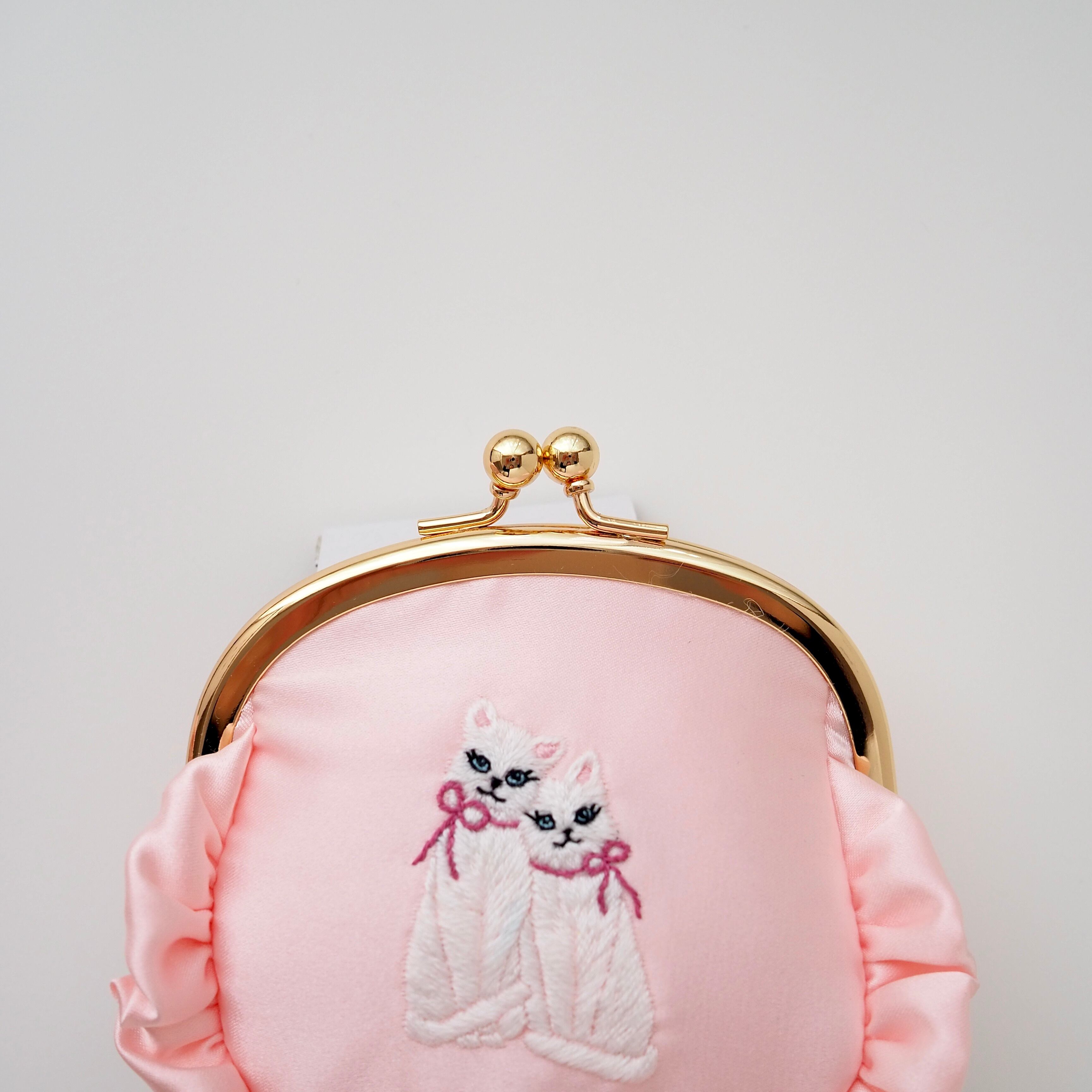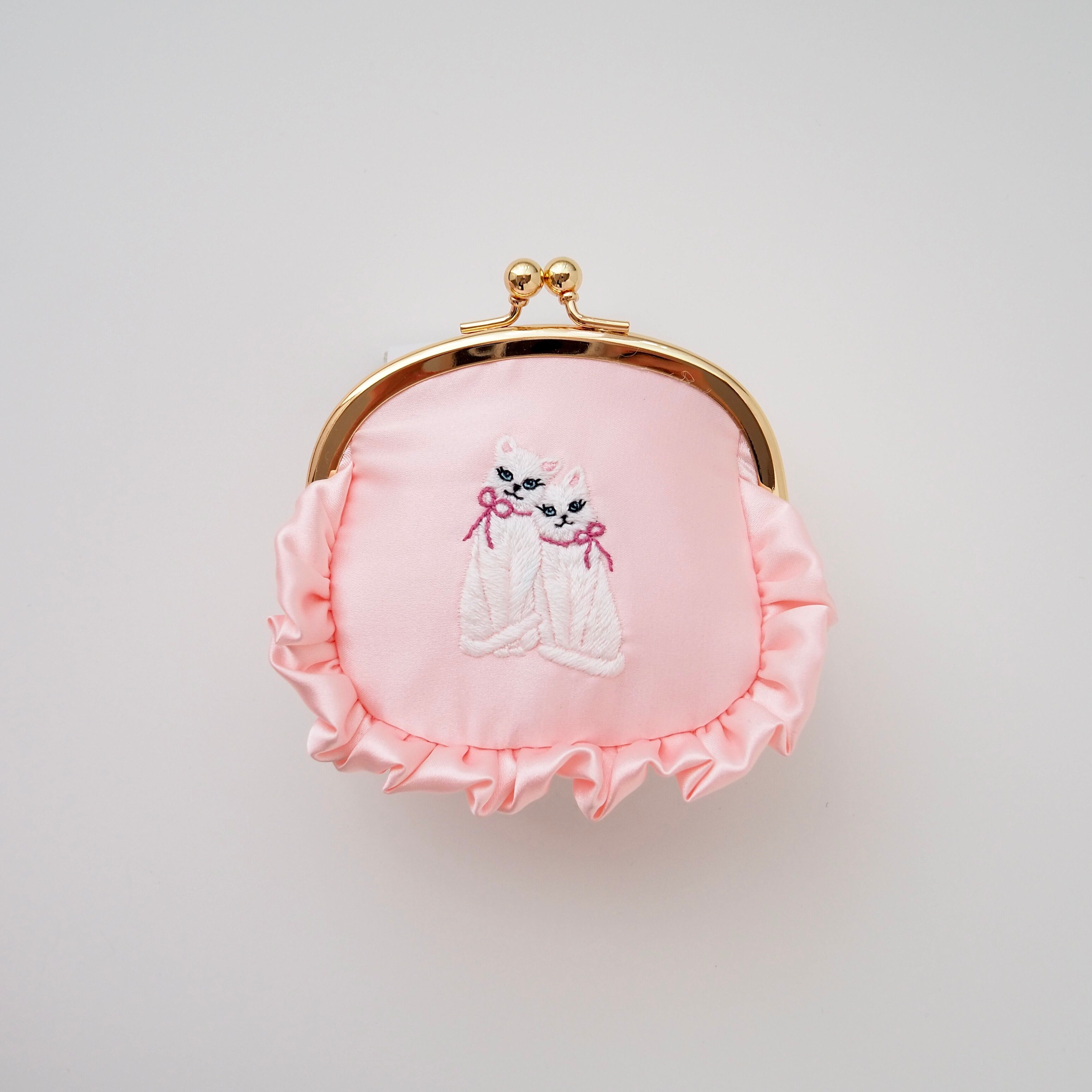 がま口ポーチ(ベビーピンク/双子猫刺繍)