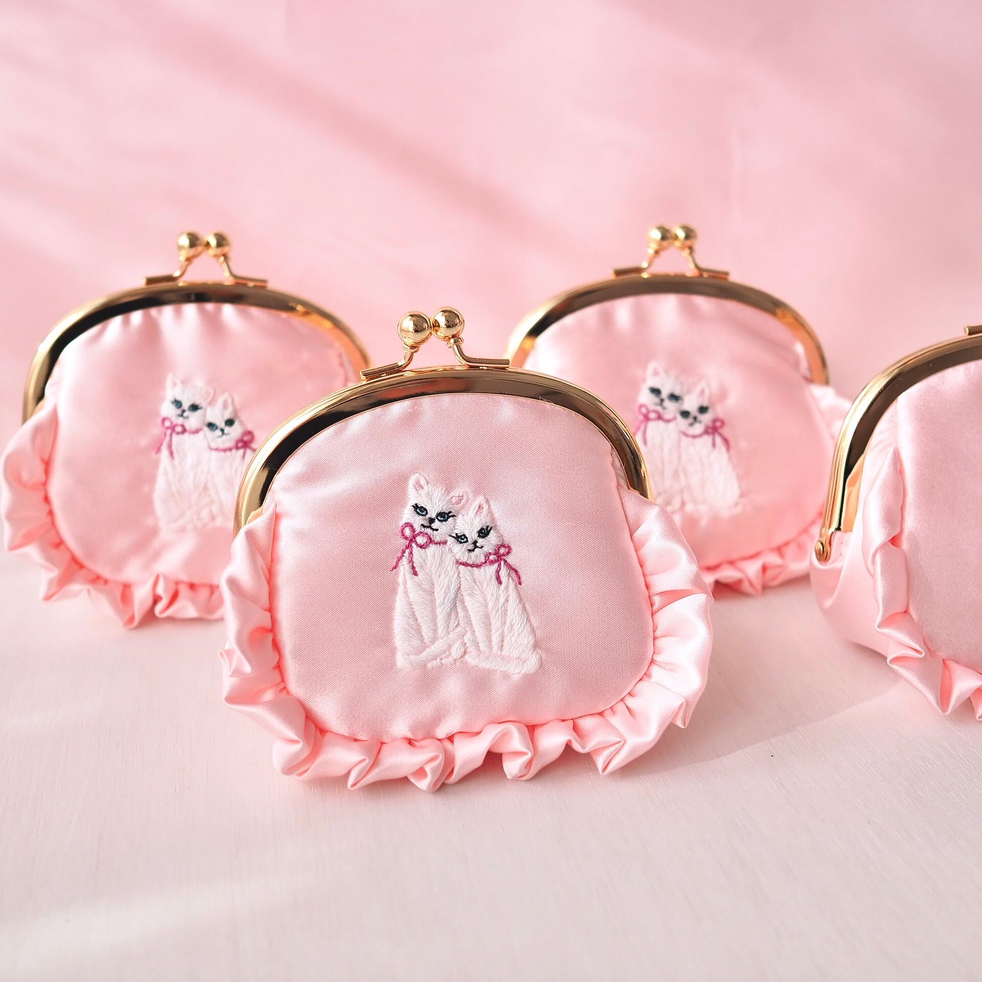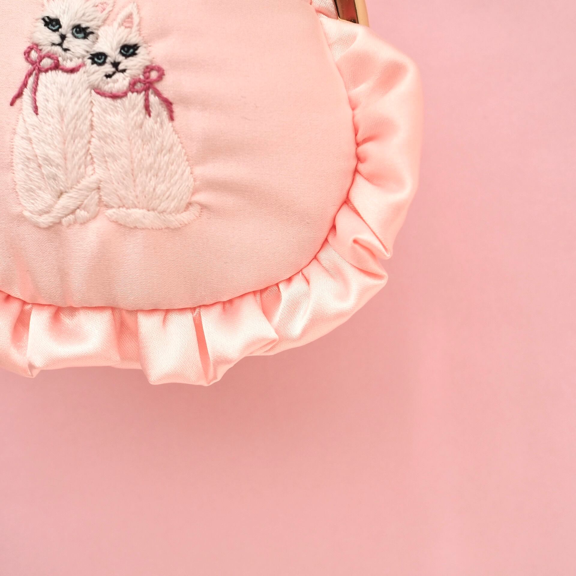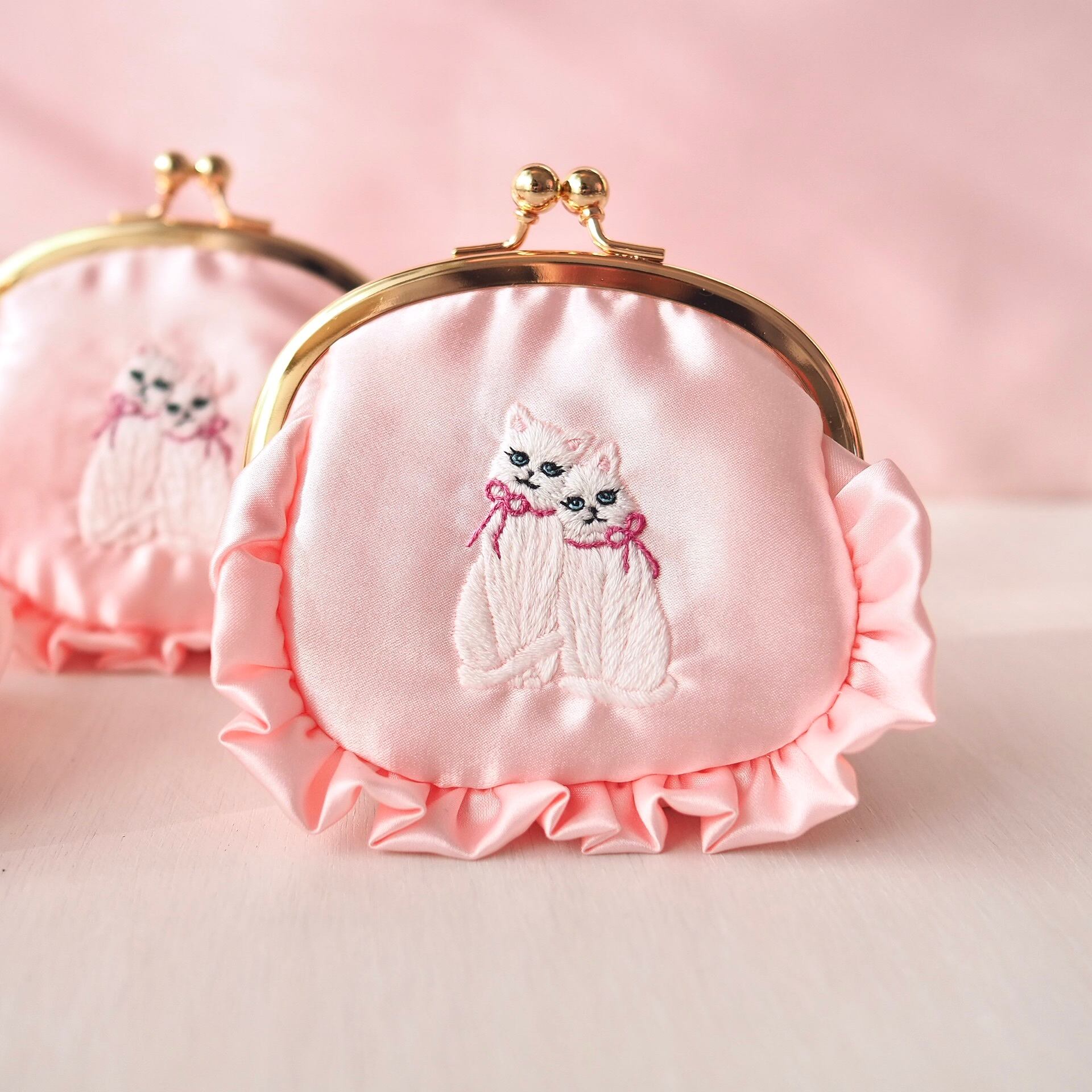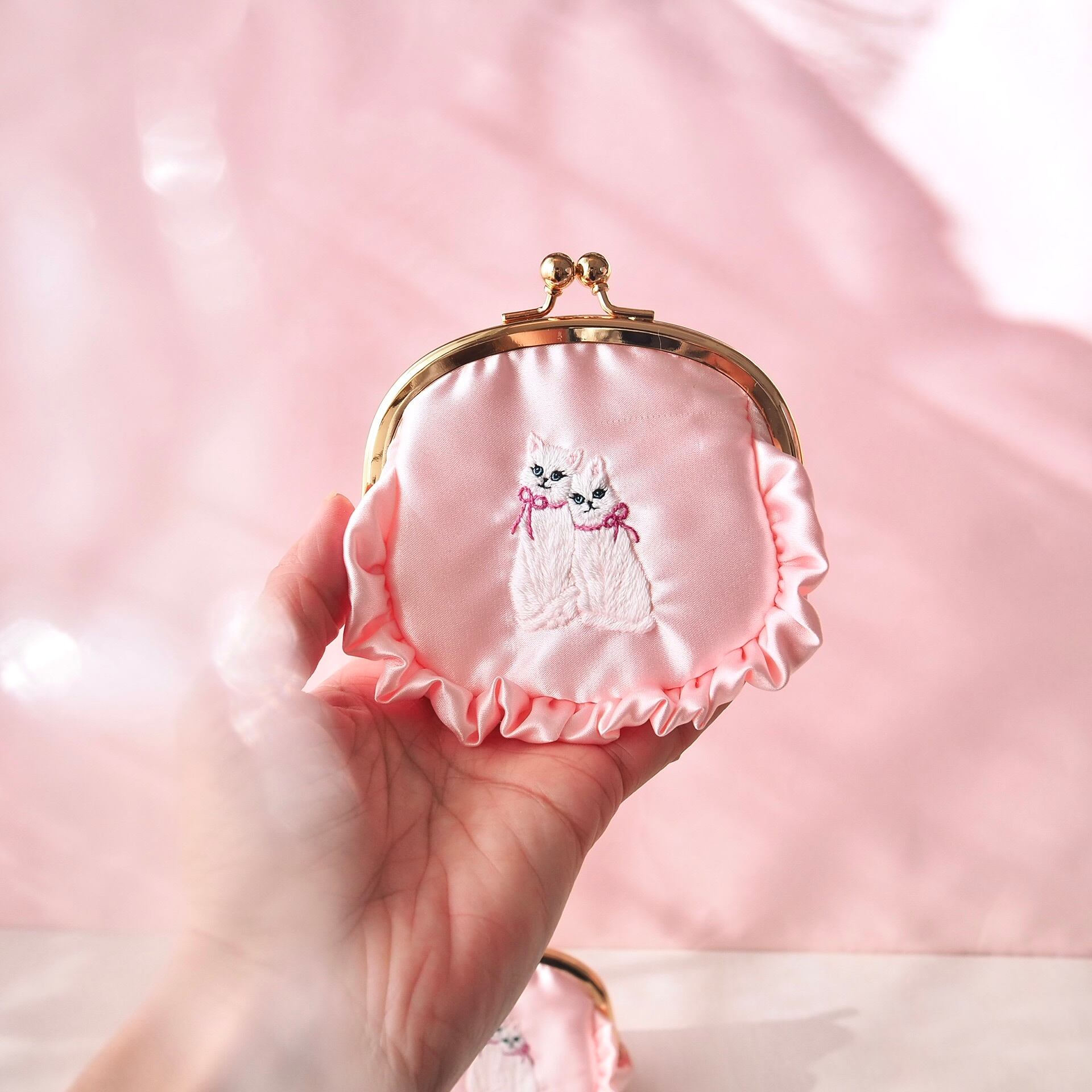 がま口ポーチ(ベビーピンク/双子猫刺繍)
