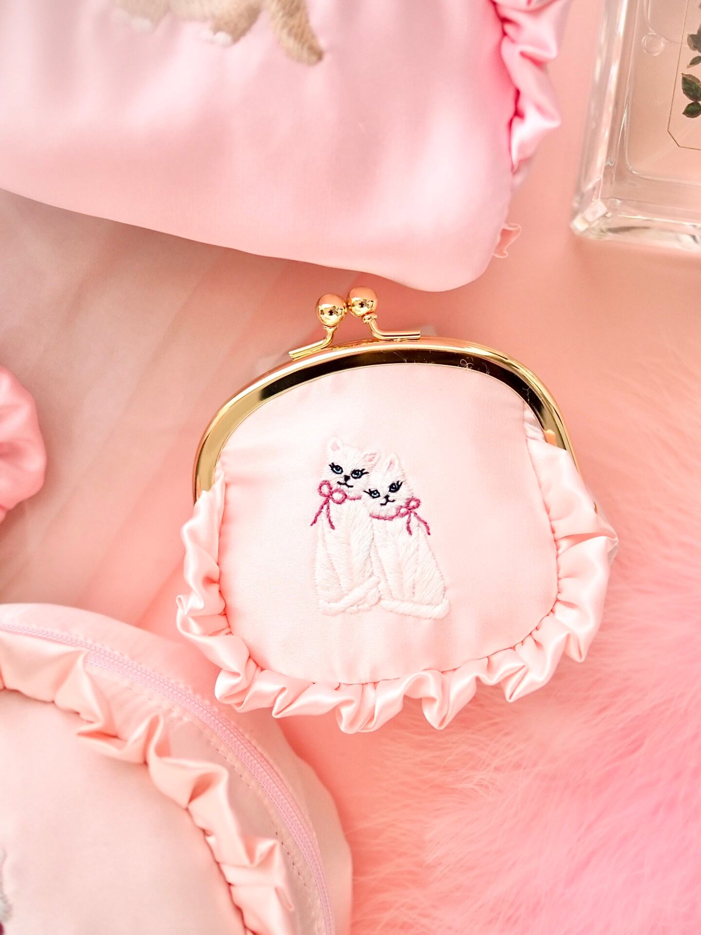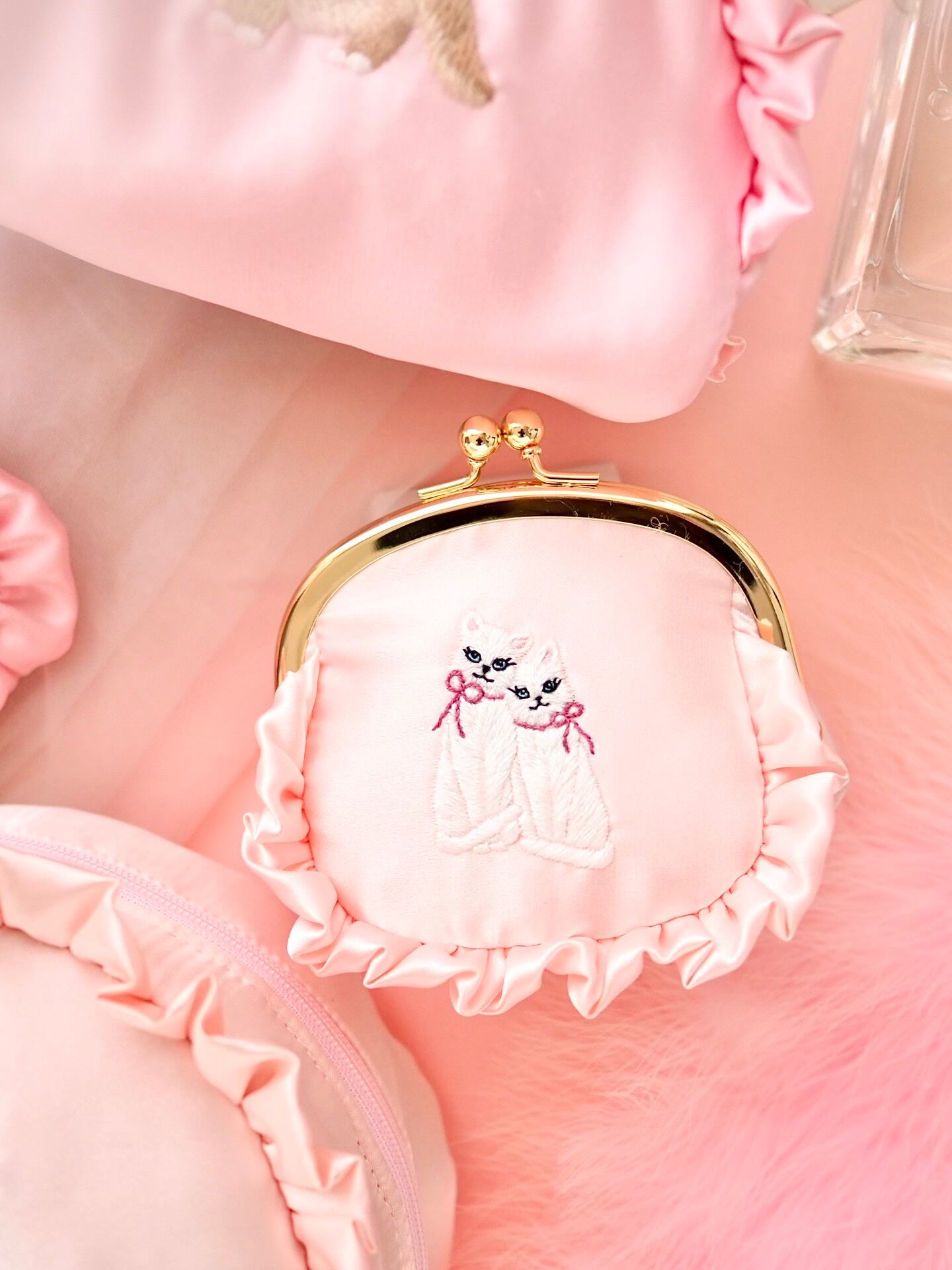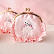 ふんわりと優しいピンクサテン生地に、仲良く寄り添う双子の妖精猫が刺繍された特別なポーチです。神秘的なオーラを纏った2匹の白猫は、それぞれ小さなリボンを身につけ、持つ人にさりげない幸せを届けてくれるようなデザインです。キラリと輝くフリルのアクセントも妖精らしさを引き立て、夢見るようなひとときをお届けします。