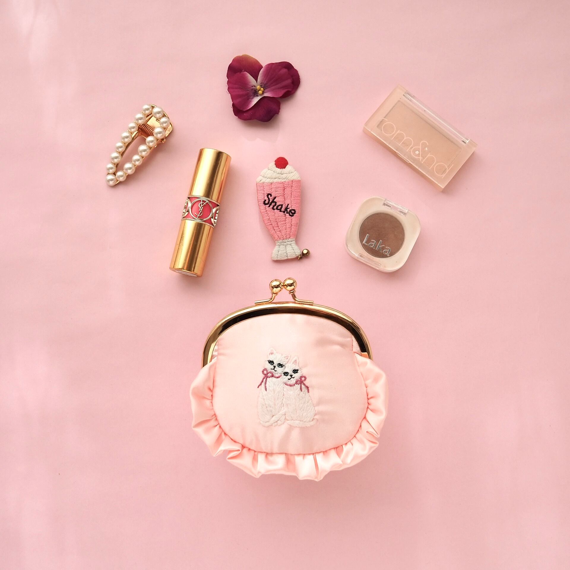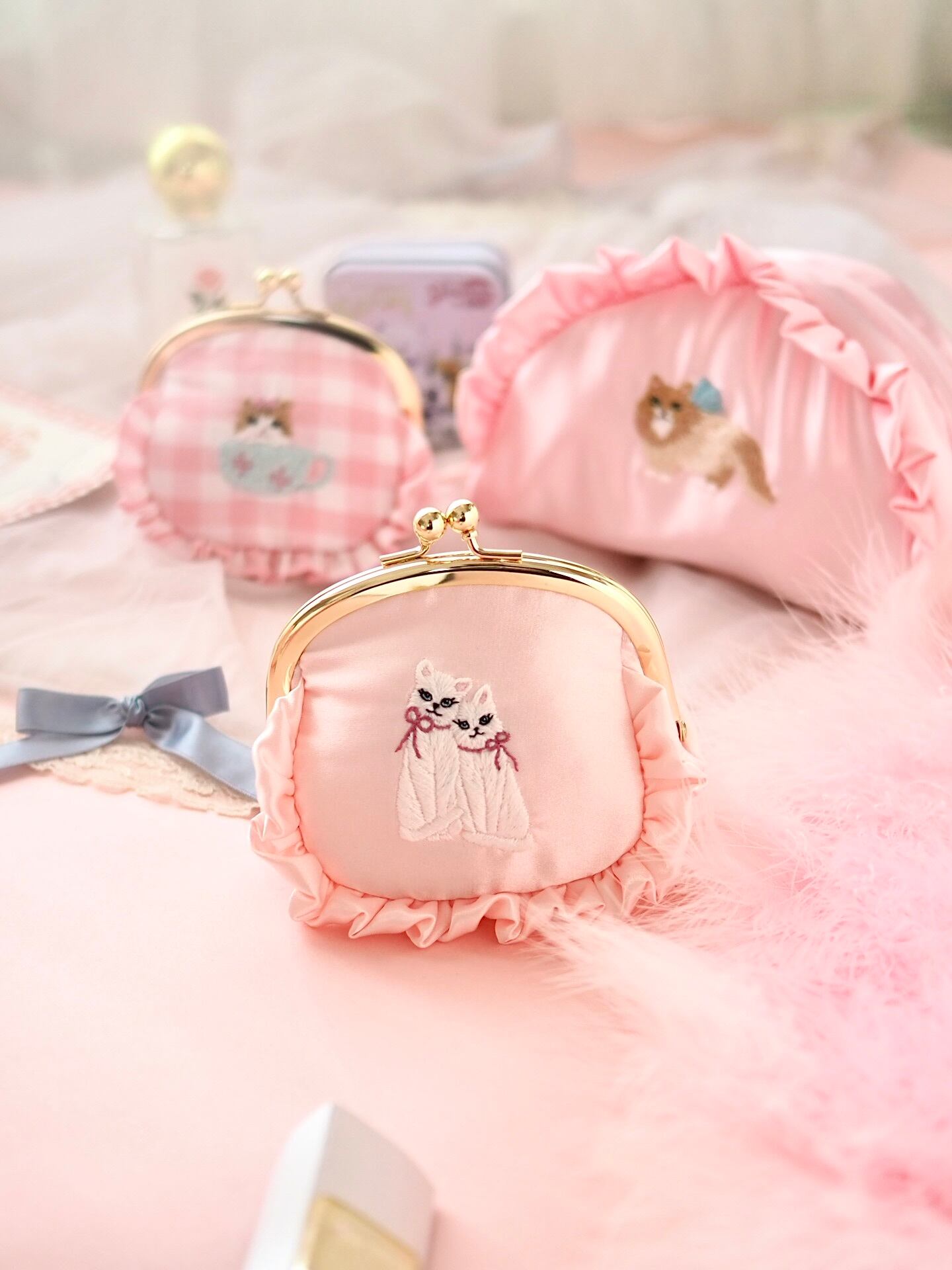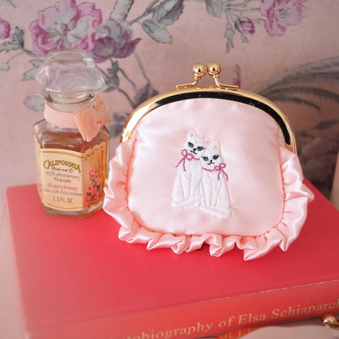 双子の妖精猫が舞い降りた、ピンクサテンのがま口ポーチ