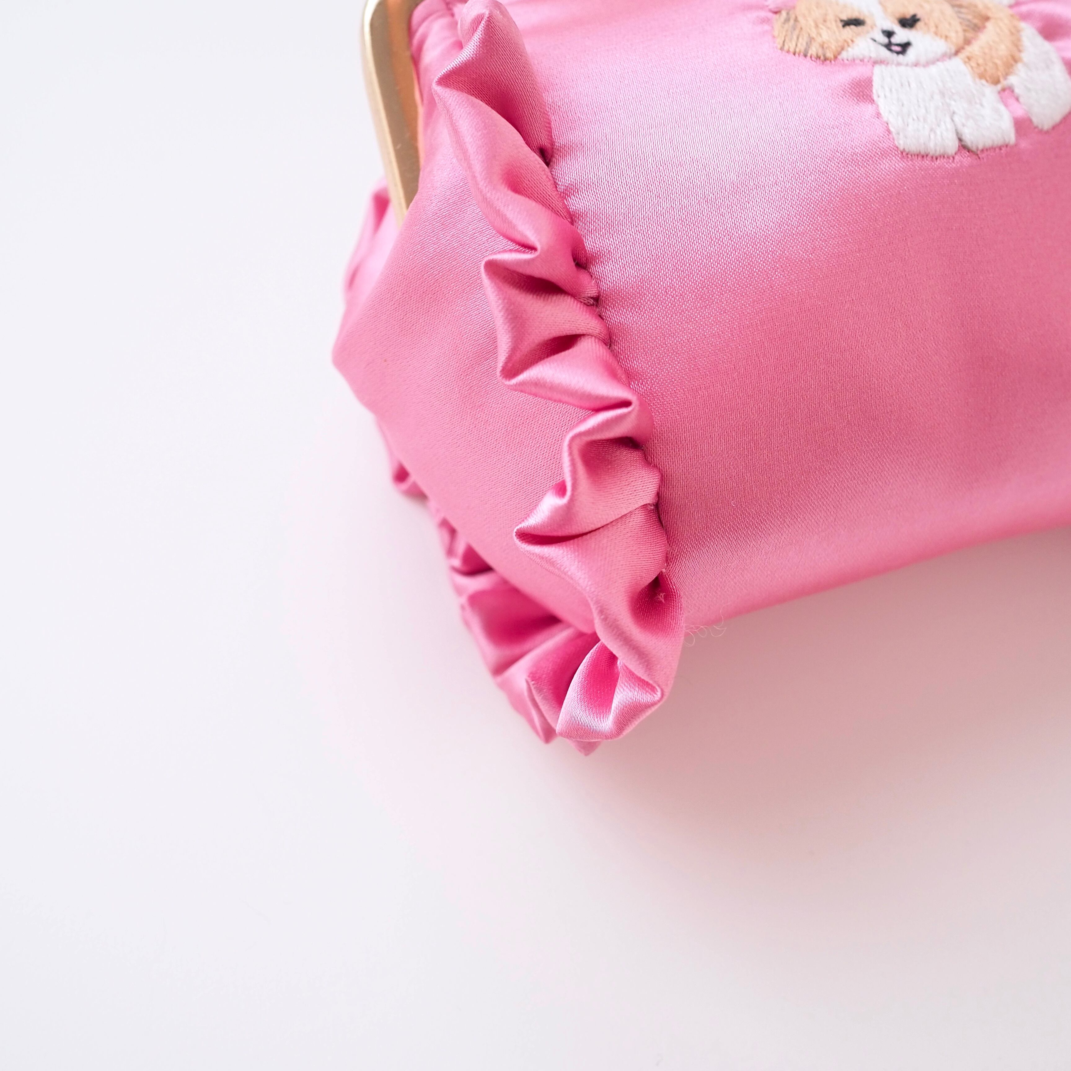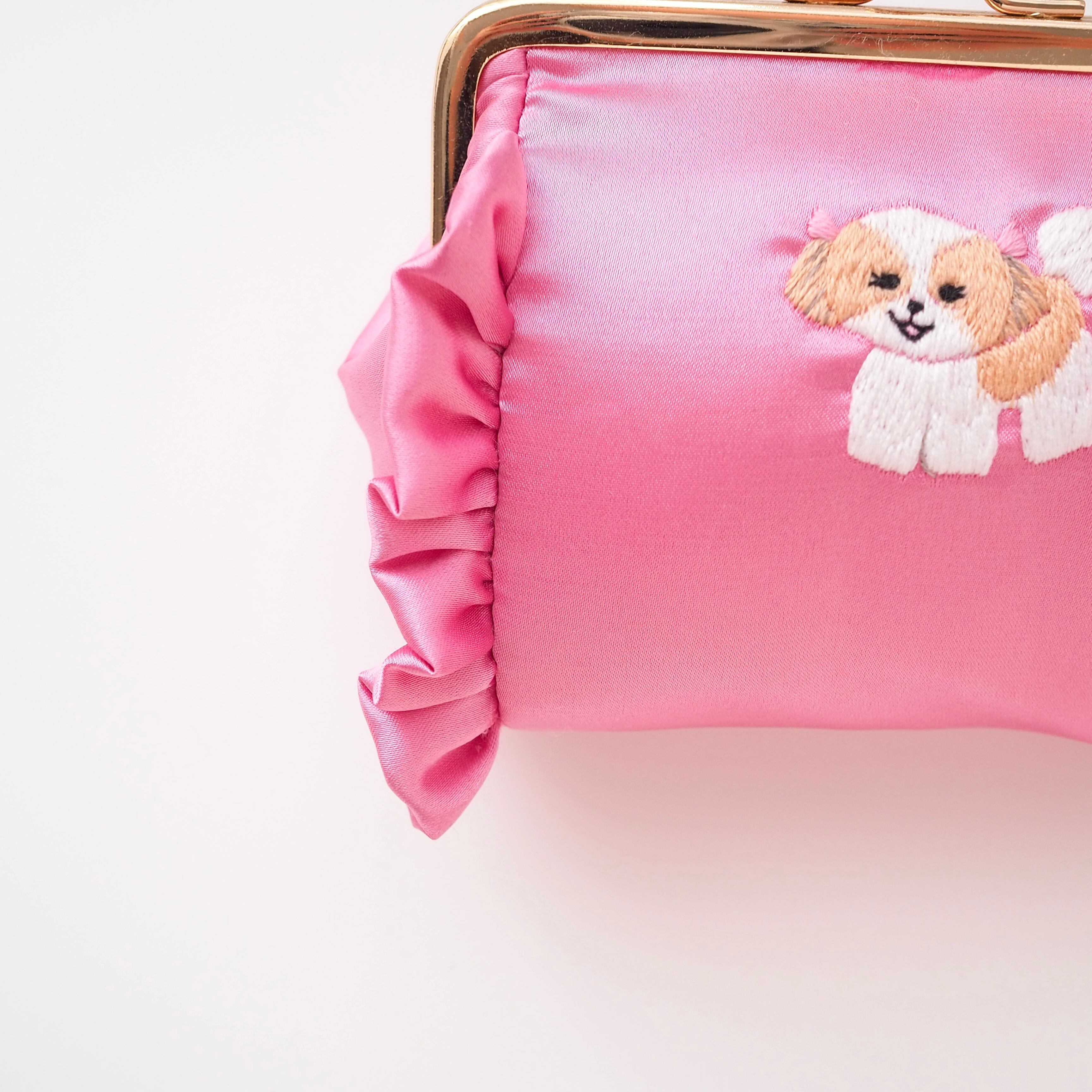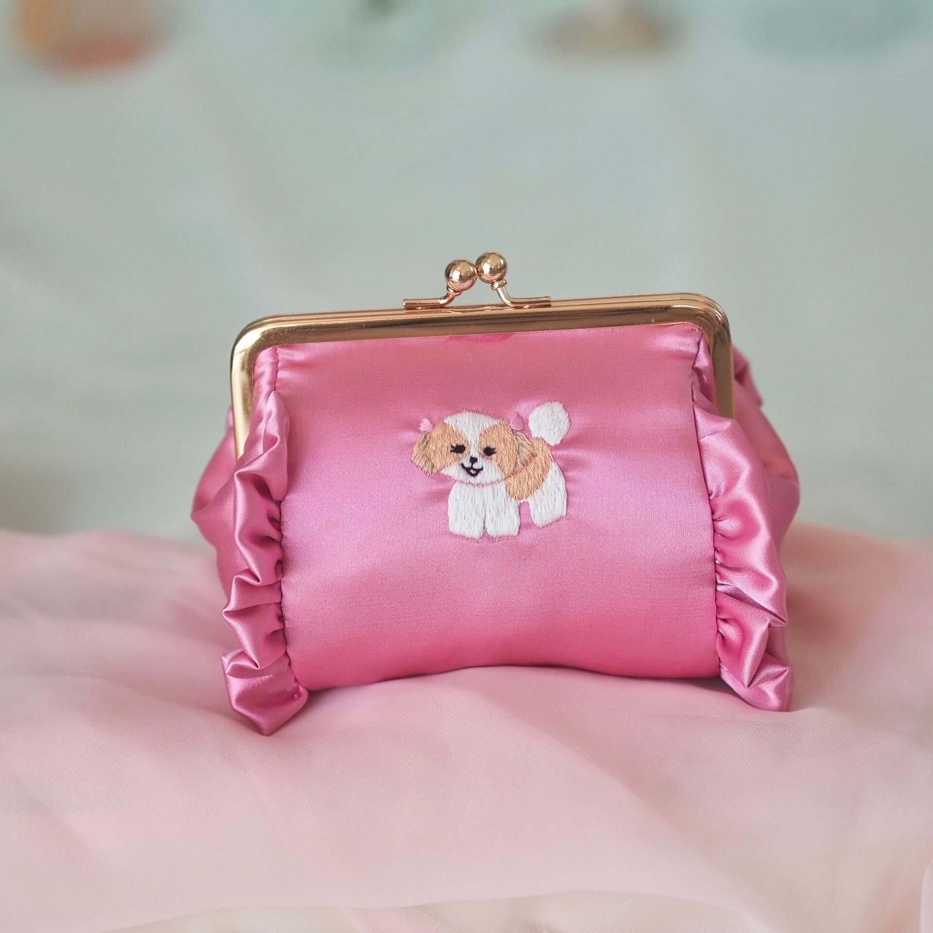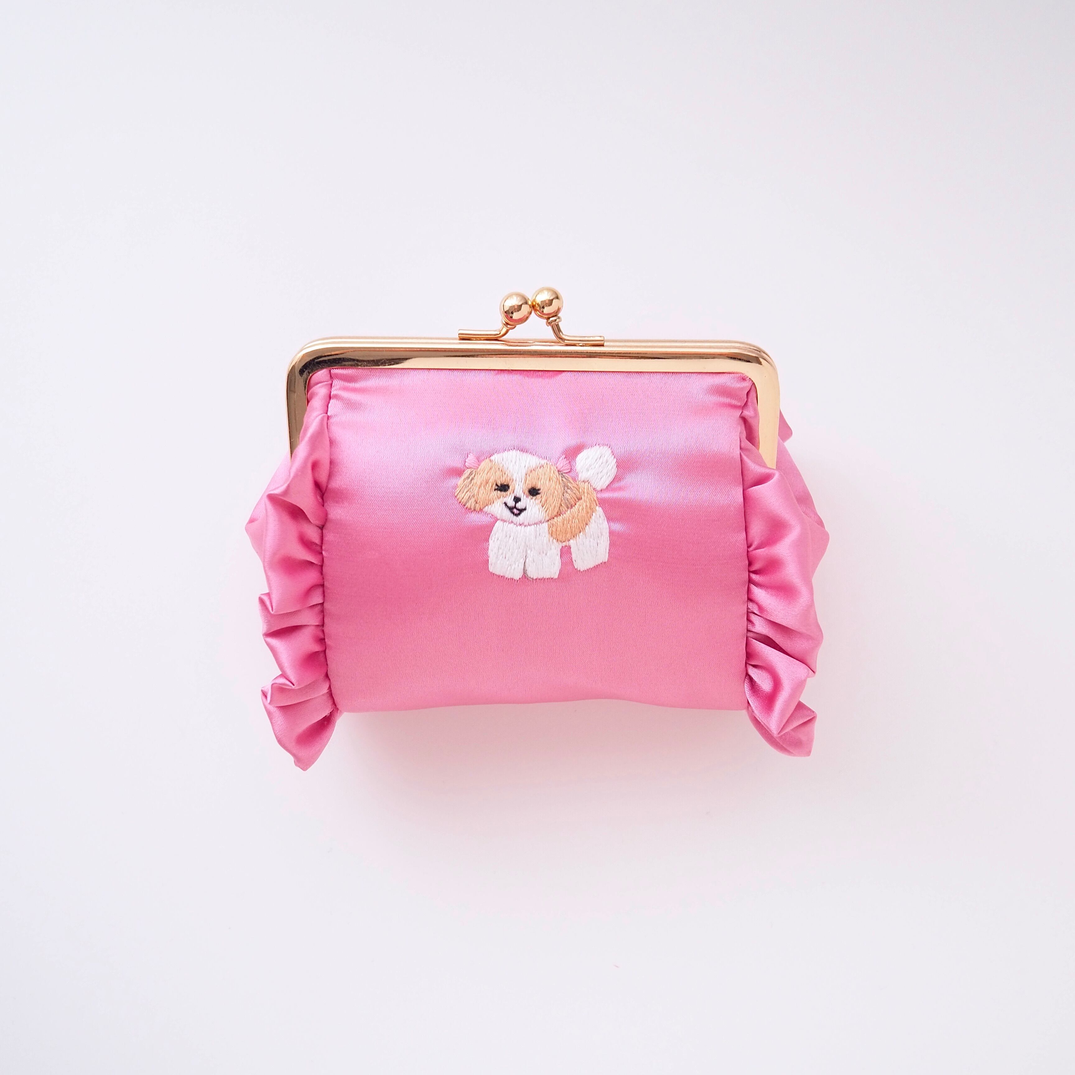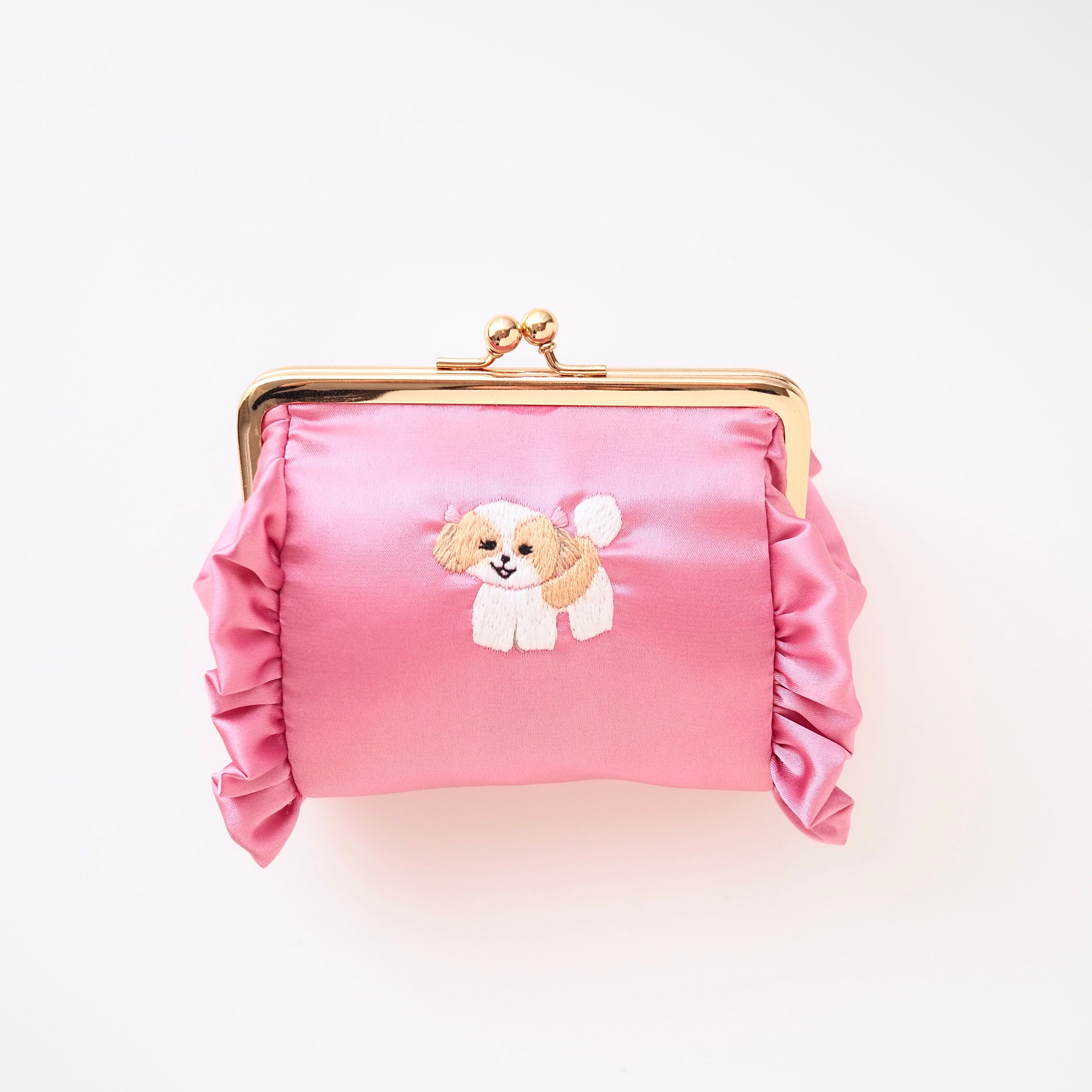 ふんわりとした毛並みが愛らしいシーズー犬が刺繍された、ピンクサテンのがま口ポーチ。つぶらな瞳と柔らかな表情が、どこかホッとする癒しのデザインです。光沢のあるピンクサテン生地とフリルが、大人の遊び心を感じさせる仕上がりに。丸みのある横マチ付きで収納力も抜群。日常にさりげない華やかさを添えてくれる、とっておきのアイテムです。